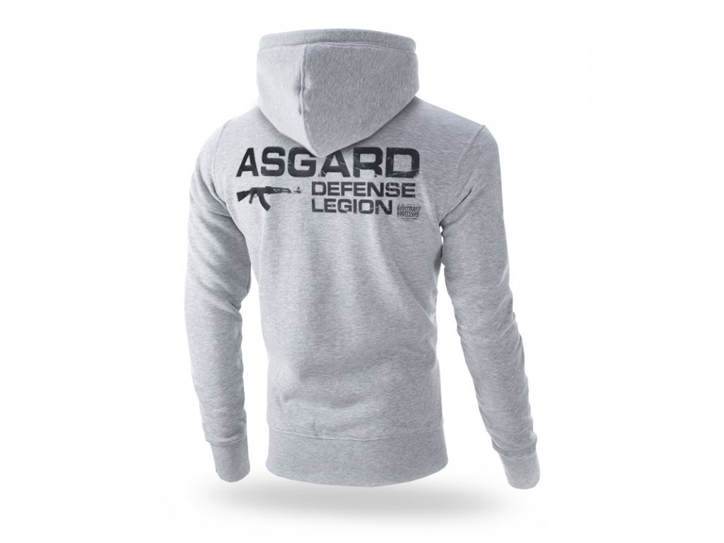 Na levém rukávu je malá cedulka s logem značky. Kapuce je ozdobená pevnou šňůrkou a kovovými zakončeními s logem značky. Na zadní straně mikiny se nachází nápis „Asgard Defense Legion”. Na text je namířená puška, vzor doplňuje logo značky Doberman’s, na přední straně je potisk v menším formátu.