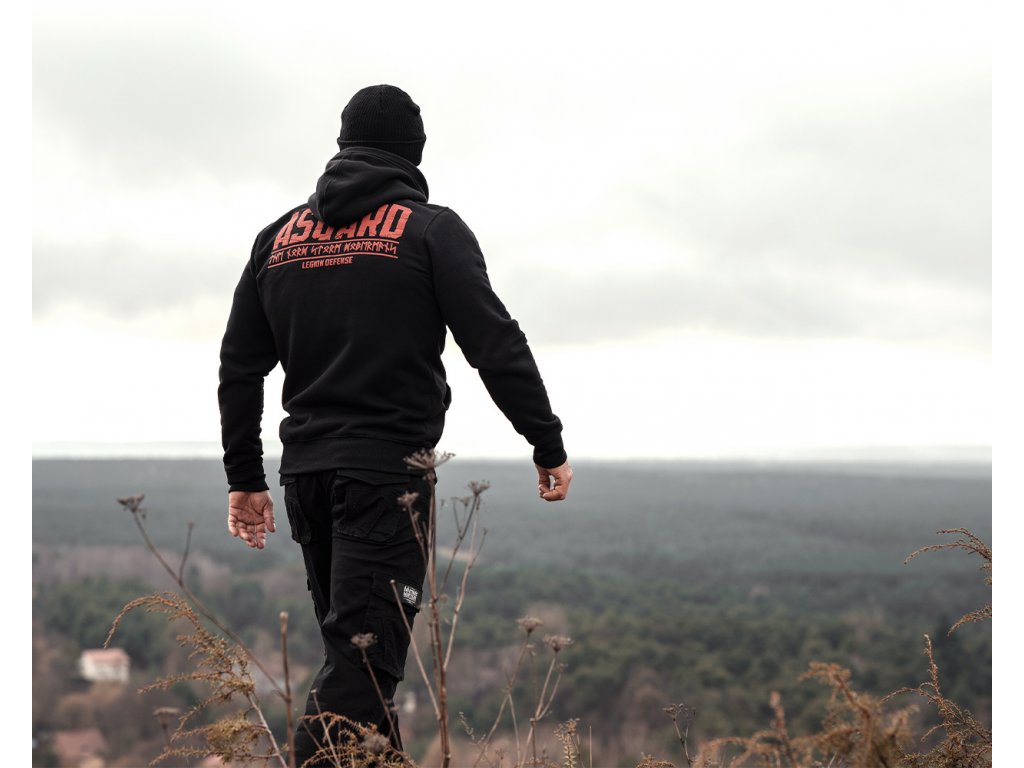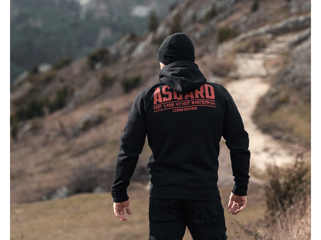 Vyrobená z vysoce kvalitní bavlny, má dvě kapsy na přední straně, zakončená stahovacími lemy. Na levém rukávu je malá cedulka s logem značky. Kapuce je ozdobená pevnou šňůrkou a kovovými zakončeními s logem značky. Model s velkým nápisem ASGARD vytvořený technikou vypouklého potisku a menším runovým nápisem.