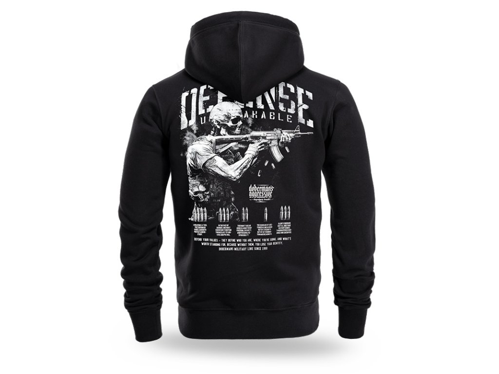 Vyrobeno z vysoce kvalitní bavlny, zajišťující pohodlí při nošení. Na zádech velký, detailní potisk zobrazující ozbrojeného válečníka s lebkou, obklopeného létajícími nábojnicemi. Nad motivem výrazný nápis "DEFENSE UNBREAKABLE". Dole doplňující grafické prvky v podobě střel a textu inspirovaného obranou a hodnotami. Na přední straně, na levé straně hrudi, malý potisk se třemi náboji a logem. Kapuce je nastavitelná pomocí šňůrek.