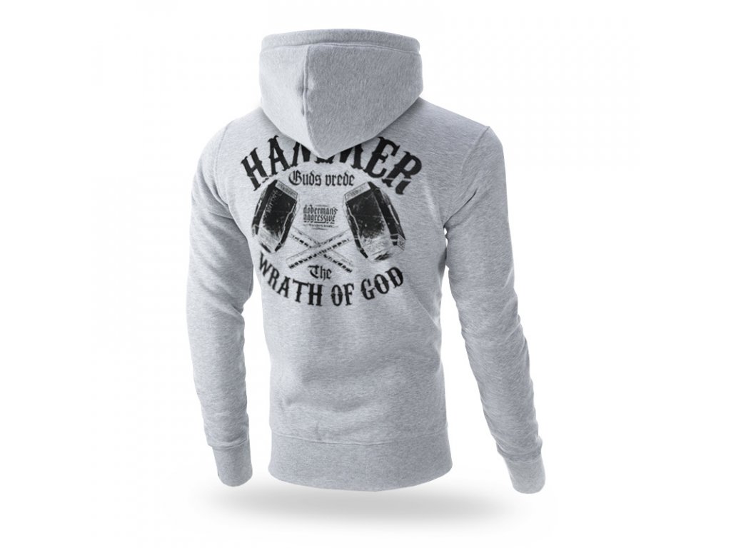 Na levém rukávu je malá cedulka s logem značky. Na zadní straně mikiny je potisk, který představuje zkřížená THOROVA kladiva a nápis HAMMER WRATH OF GOD a menší logo značky DOBERMAN’S. Na levé straně hrudi se opakuje potisk, umístěný vzadu v menším formátu.
