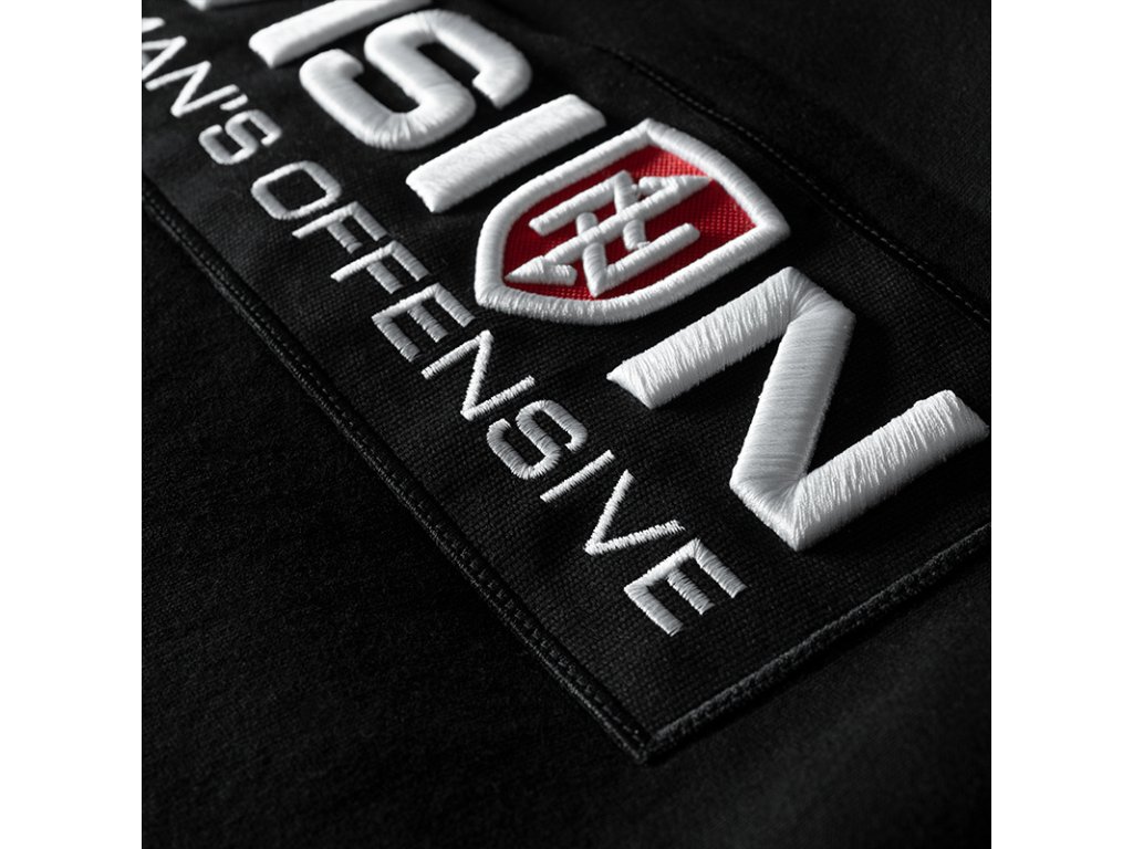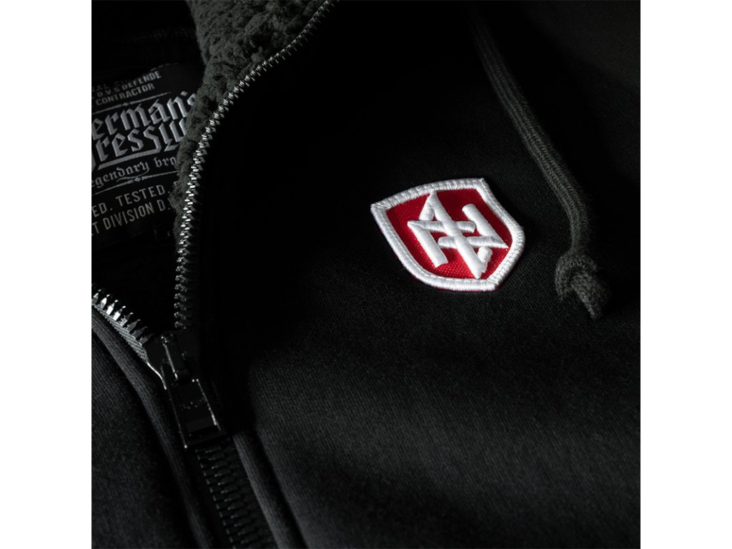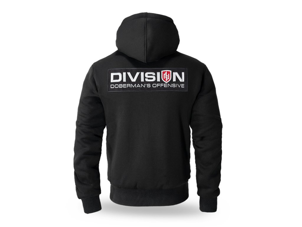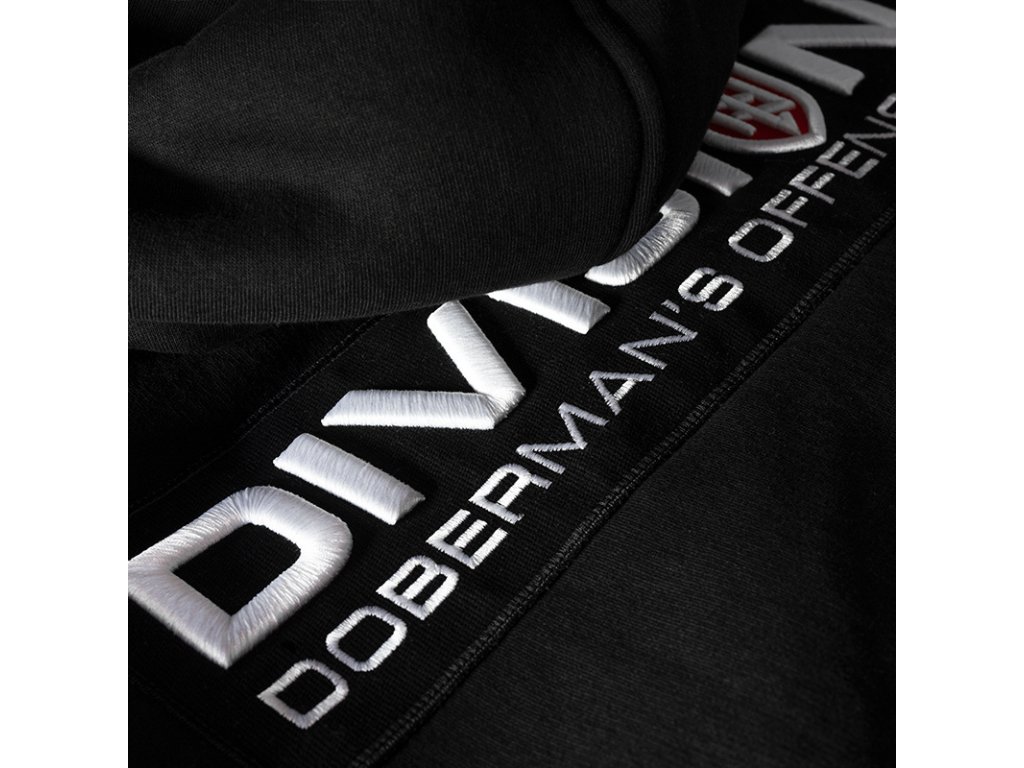 U kapuce jsou široké šňůrky s kovovými zakončeními, na přední straně jsou našité dvě kapsy. V dolní části je zakončená odolnými stahovacími lemy. Mikina má na hrudi černou nášivku s 3D výšivkou „DIVISION Doberman’s Offensive”. Na přední straně hrudi se nachází malá nášivka ve tvaru štítu, která představuje naše logo, také vytvořená technikou 3D výšivky.