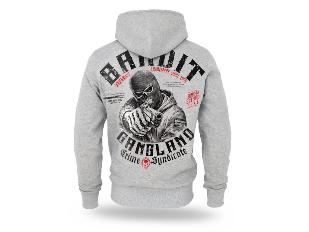 Model je vyroben v pohodlném střihu s kapucí vybavenou šňůrkami a zapínáním na zip po celé délce. Na zadní straně se nachází velký výrazný potisk zobrazující maskovanou postavu mířící zbraní, obklopenou nápisem „Banditz Gangland Crime Syndicate“ a dalšími grafickými prvky charakteristickými pro značku Doberman’s Aggressive. Na přední straně je umístěn menší potisk na úrovni hrudi. Mikina má dvě praktické přední kapsy a náplety na rukávech a spodním lemu, které zajišťují dobré přizpůsobení a pohodlí při nošení. Dynamická grafika zdůrazňuje syrový charakter inspirovaný streetwearovou kulturou.