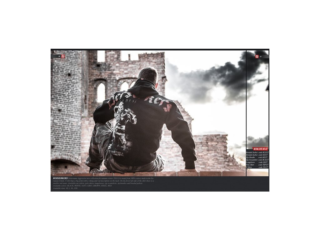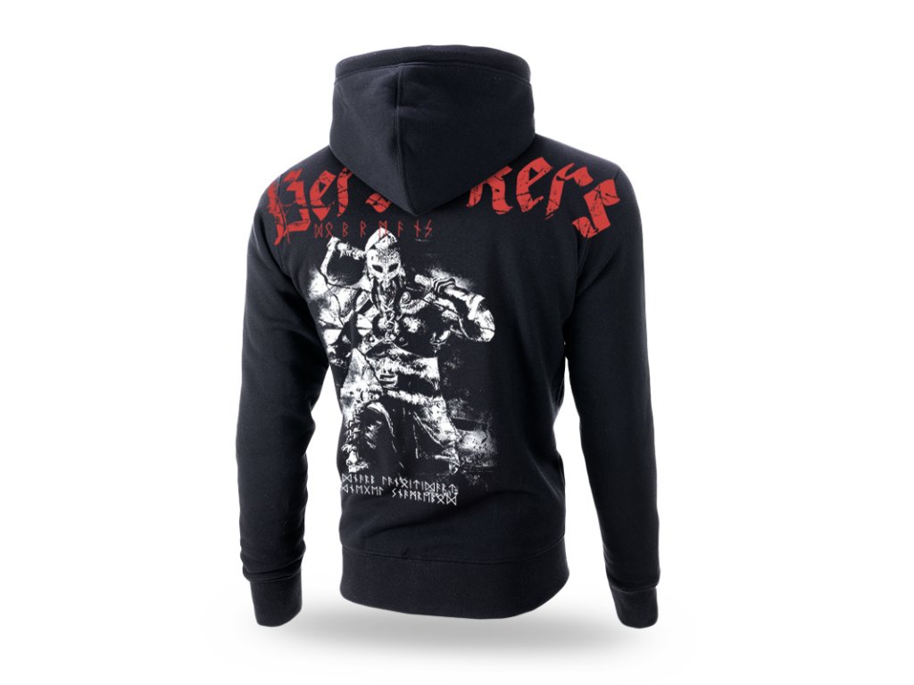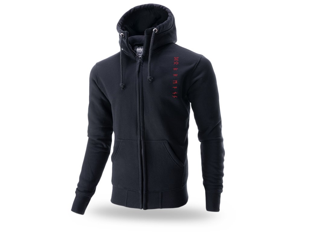 Má vysoký límec. Dolní část a rukávy mikiny ukončeny stahovacím lemem, u kapuce šňůrky, kovové prvky a nášivka. Uvnitř produktu velká barevná cedulka a červený lem. Vepředu svislý potisk podél levého švu. Použity runové symboly. Zadní strana zdobena velkou dvoubarevnou grafikou s postavou Vikinga, který drží sekyru. Na úrovni lopatek nápis s názvem kolekce procházející přes švy rukávů. Zřetelný efekt rozpraskání potisku.