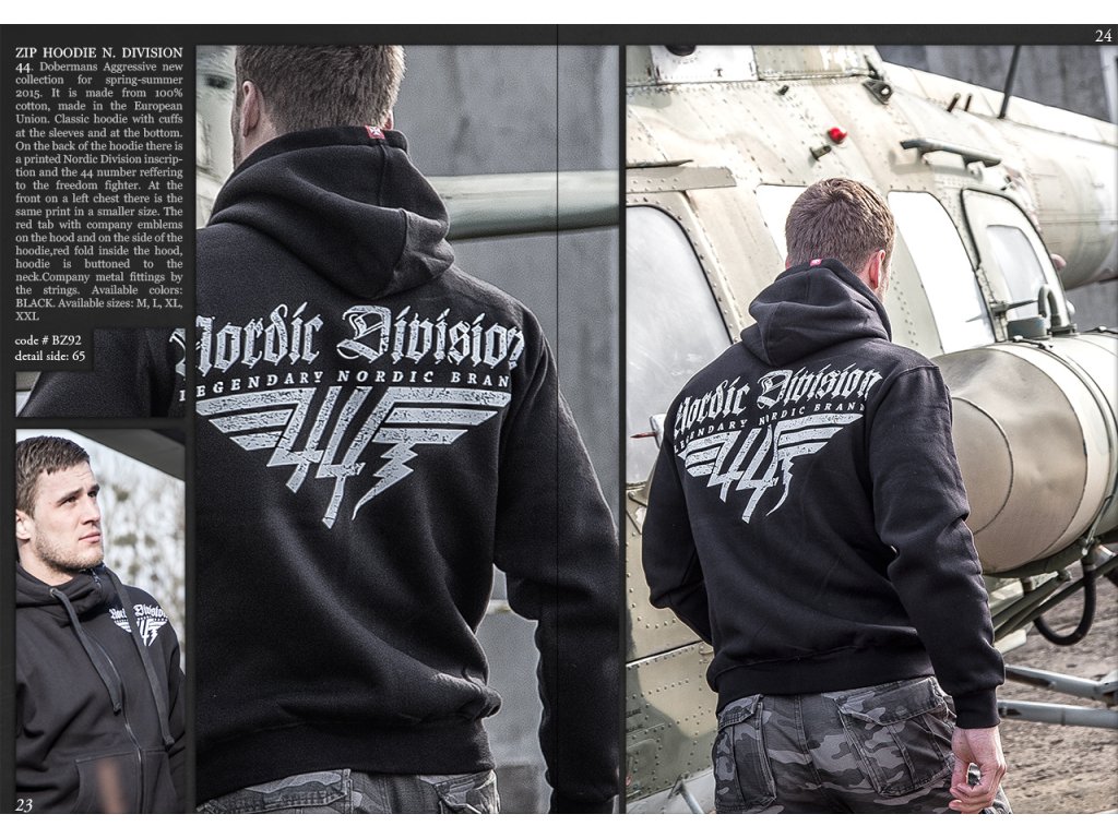 Vepředu dvě našívané kapsy. Propínací model s vysokým límcem je ukončen širokými stahovacími lemy. U kapuce šňůrky, kovové prvky a červená nášivka s logem značky. Uvnitř léga a velký štítek s motivem orla. Na zádech jednobarevná grafika s efektem rozpraskání potisku. Vzor s motivem křídel a blesku. V centrálním místě symbol 44. Na úrovni lopatek nápis Nordic Divison v gotickém stylu. Vepředu, pod límcem, kopie loga v menším měřítku.