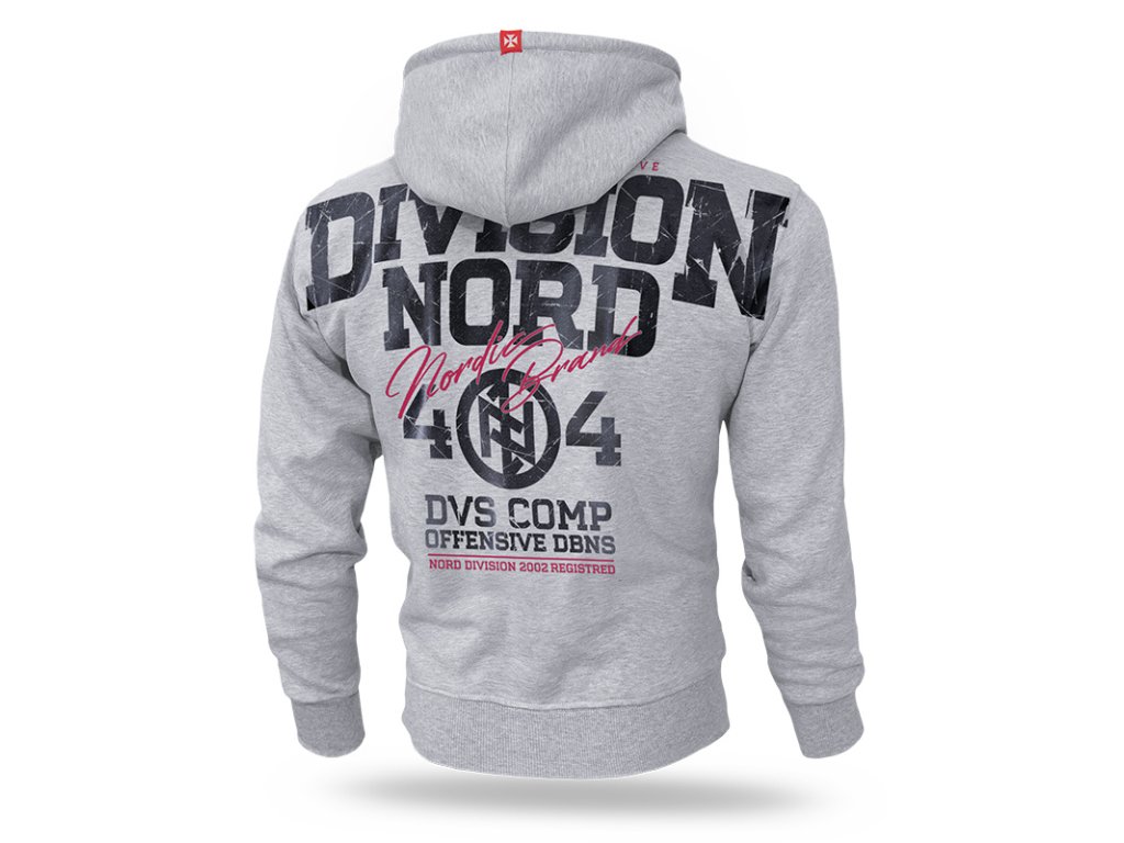 Má praktický, vysoký stojáček, který přechází v objemnou kapuci. U kapuce jsou šňůrky a kovová zakončení. Na srdci je nevelký nápis Division Nord a číslo 404. Záda jsou pokrytá potiskem, který přechází přes švy rukávů. Vzor se skládá z nápisů Division Nord Nordic Brand. Použitý efekt zničení vzoru.