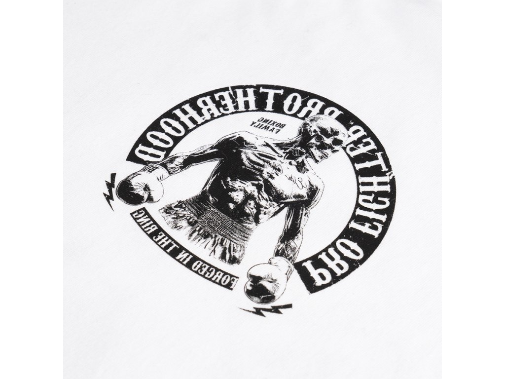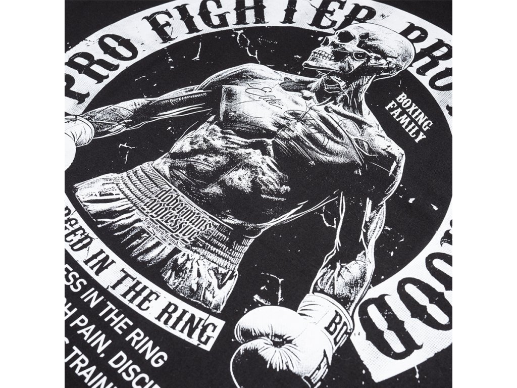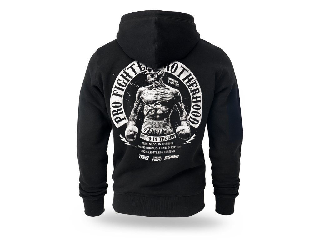 Model je vyroben v pohodlném sportovním střihu s kapucí nastavitelnou pomocí šňůrek a zapínáním na zip po celé délce. Mikina má dvě přední kapsy a žebrované lemy na rukávech a spodním okraji pro lepší přizpůsobení. Na zadní straně se nachází velký potisk s motivem boxera a nápisem „Pro Fighter Brotherhood – Forged in the Ring“, který zdůrazňuje sílu, odhodlání a bojového ducha. Na hrudi je umístěno menší logo ve stejném stylu. Model spojuje pohodlí pro každodenní nošení s výrazným stylem inspirovaným světem boxu a bojových sportů.