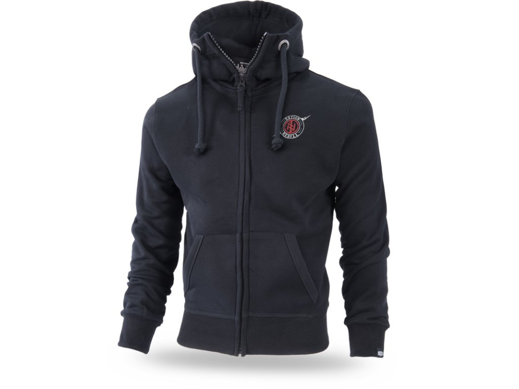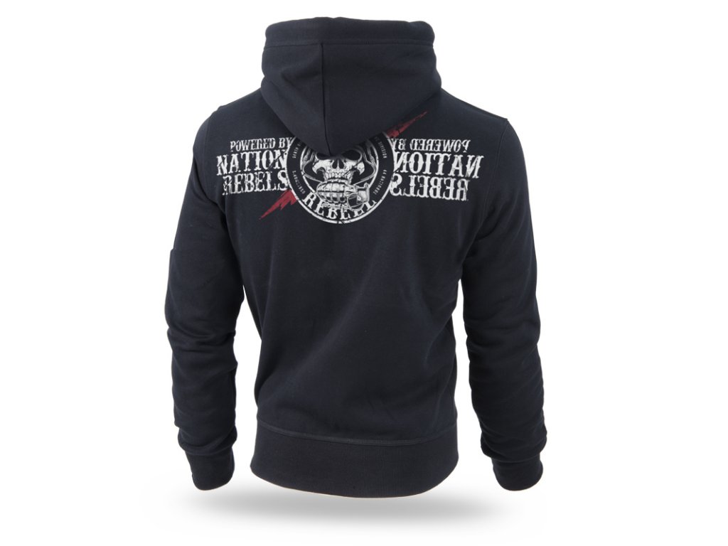 Na přední straně dvě praktické kapsy a nevelký dvoubarevný potisk s runovým motivem a dvěma blesky. Zadní strana zdobená velkým vzorem v podobě razítka. Uprostřed vzoru lebka ve vojenské helmě s maltézským křížem. Přidáno granát a dva blesky. Kolem heslo Nation Rebell, po stranách nápis Powered By Nation Rebels. Dvojbarevný potisk, s viditelným efektem předření. Mikina je vyrobena z bavlněné látky o hmotnosti 320g a zakončená stahovacími lemy.