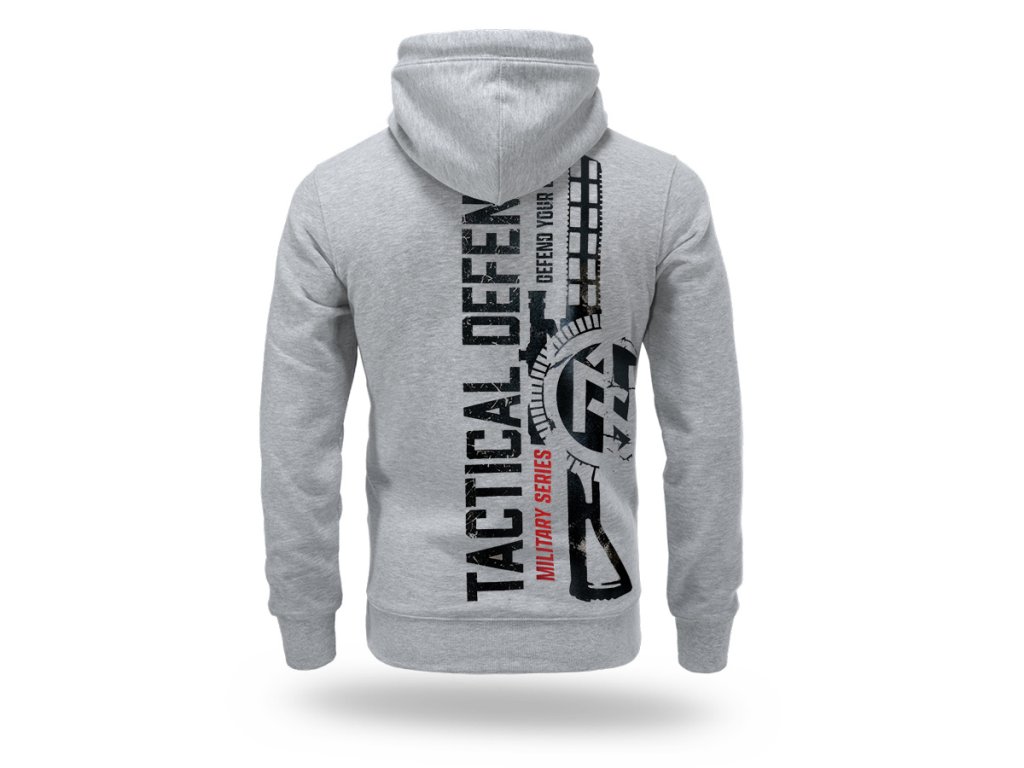 Model je vyroben z kvalitního materiálu zajišťujícího pohodlí a odolnost. Mikina má nastavitelnou kapuci se šňůrkami a žebrované manžety a spodní lem pro lepší přizpůsobení. Na zádech se nachází velký vertikální potisk „TACTICAL DEFENSE“ s motivem zbraně a nápisem „Military Series“, zatímco na přední straně je decentní logo s lebkou a zkříženými zbraněmi umístěné na hrudi. Ideální volba pro ty, kteří preferují vojenský styl a výraznou grafiku.
