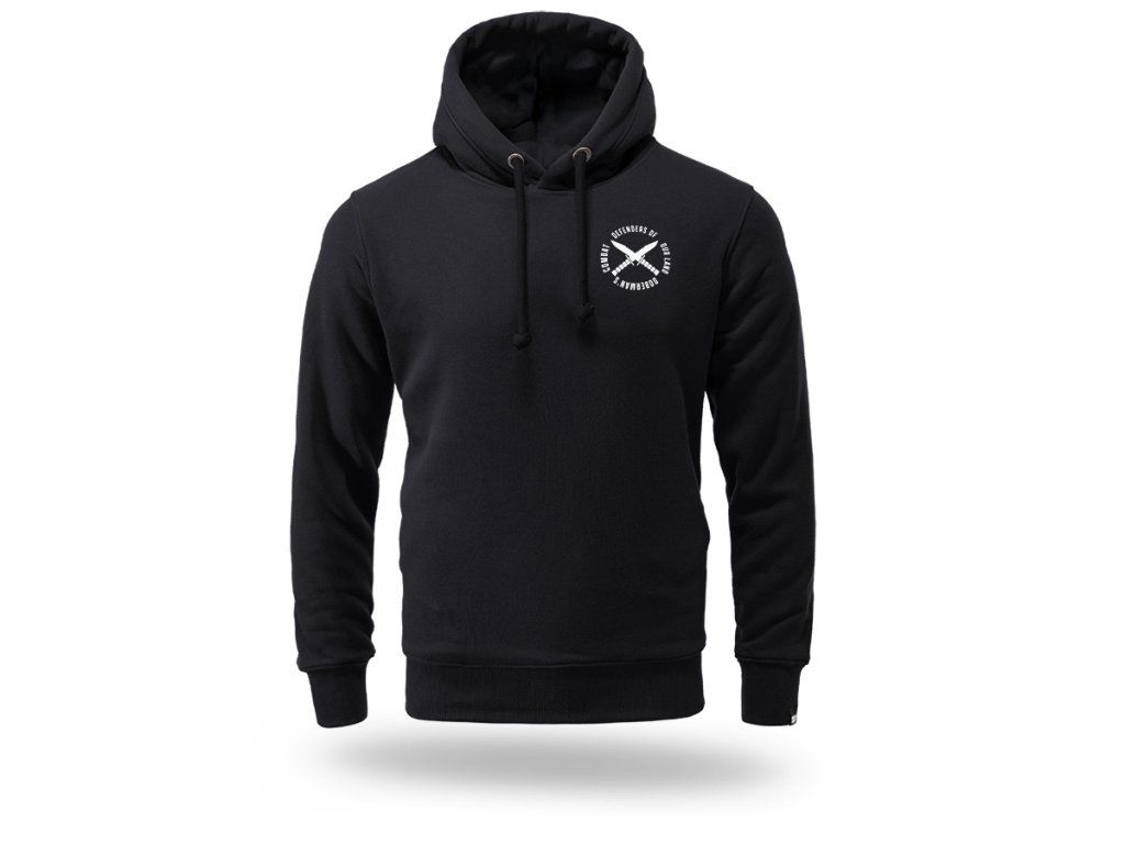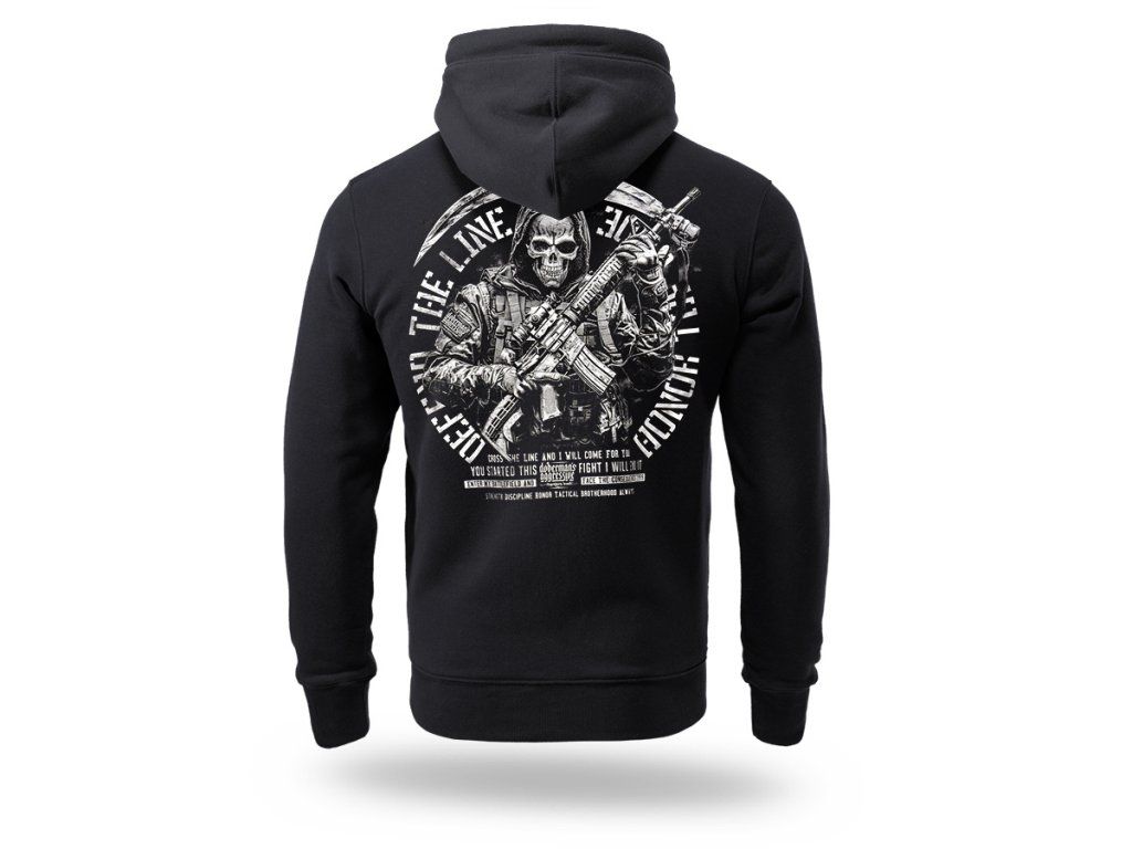Model je vyroben v pohodlném sportovním střihu s kapucí nastavitelnou pomocí šňůrek a s žebrovanými lemy na rukávech a spodním okraji pro lepší přizpůsobení a komfort při nošení. Na zadní straně se nachází velký potisk zobrazující ozbrojenou postavu v taktickém stylu a nápis „Protect – Live – Honor“, symbolizující odvahu, loajalitu a připravenost k akci. Na hrudi je umístěno menší logo v minimalistickém stylu. Mikina je navržena pro každodenní nošení a kombinuje pohodlí s výrazným stylem inspirovaným vojenskou a taktickou estetikou. Pečlivě zpracovaný potisk a kvalitní provedení zdůrazňují charakter a odolnost modelu.