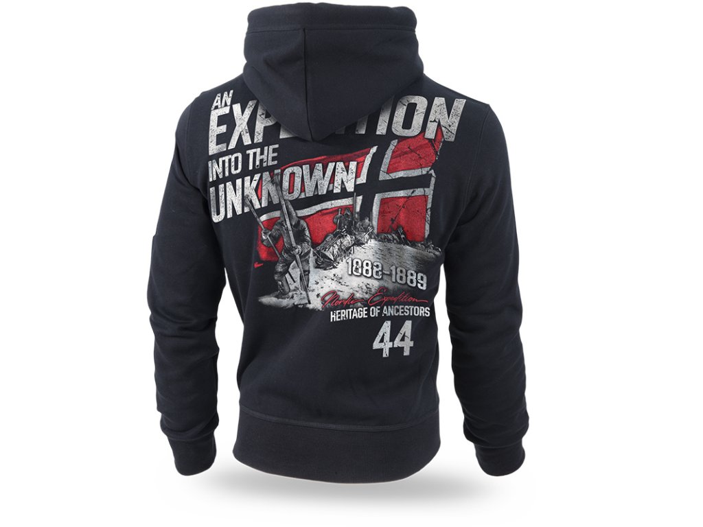 Zvýšený límec přechází v širokou kapuci, kterou je možné nastavit pomocí šňůrek. V dolní části levého rukávu je nevelká cedulka, velká cedulka je uvnitř mikiny. Na každé je logo Dobermans Aggressive. Dolní část mikiny a rukávů je zakončená odolnými stahovacími lemy. Na levé straně hrudi je malý potisk s norskou vlajkou. Zezadu mezi rameny je potisk s postavami, které putují ve sněhu. V pozadí vlaje vlajka, vedle je viditelný nápis An Expedition into the Unknown. Model ve stylu řady Expedition.