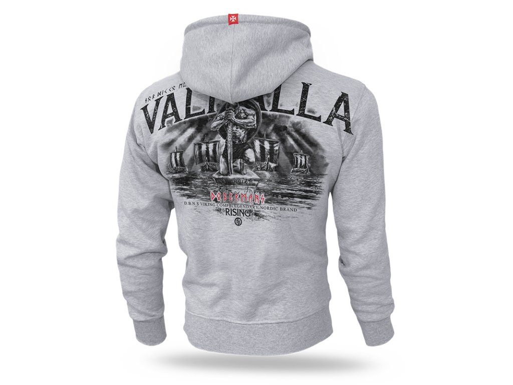 Širokou kapuci je možné jednoduše nastavit pomocí šňůrek. Uvnitř je velká cedulka s logem Dobermans Aggressive. Na zádech je viditelný vzor s bojovníkem, který klečí na podstavci. Opírá se o meč. Za postavou je moře a plující drakkary. Model podporuje řadu Vikings. Mezi rameny je vytištěný velký nápis Valhalla. Na přední straně, na levé straně hrudi je menší potisk s nápisy a runovým symbolem. Oblečení je vyrobeno z bavlny o hmotnosti 320g.
