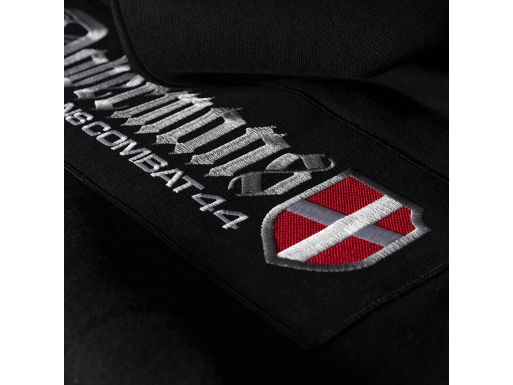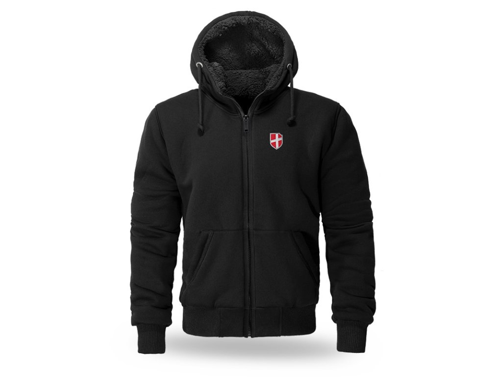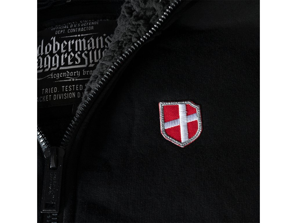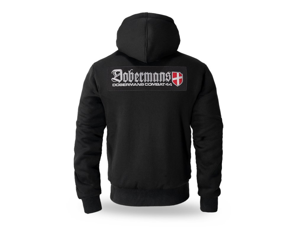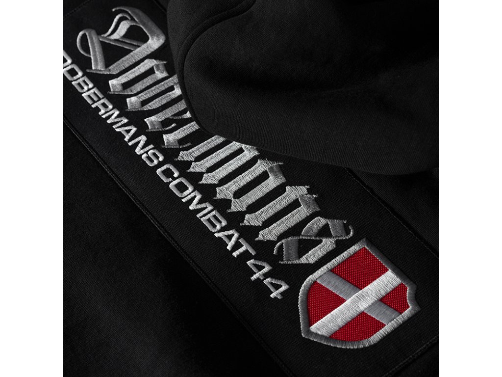 U kapuce šňůrky s kovovým zakončením a šedá firemní cedulka. Model zakončený širokými elastickými stahovacími lemy. Mikina vyrobená z bavlny a podšitá vrstvou kožichu. Na lopatkách široká obdélníková nášivka s vyšívanými prvky: logo Dobermans a znak štítu s křížem v norském stylu. Na levé straně hrudi nevelká vyšívaná nášivka v podobě štítu se stejným vzorem.