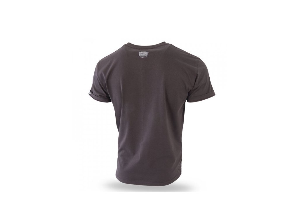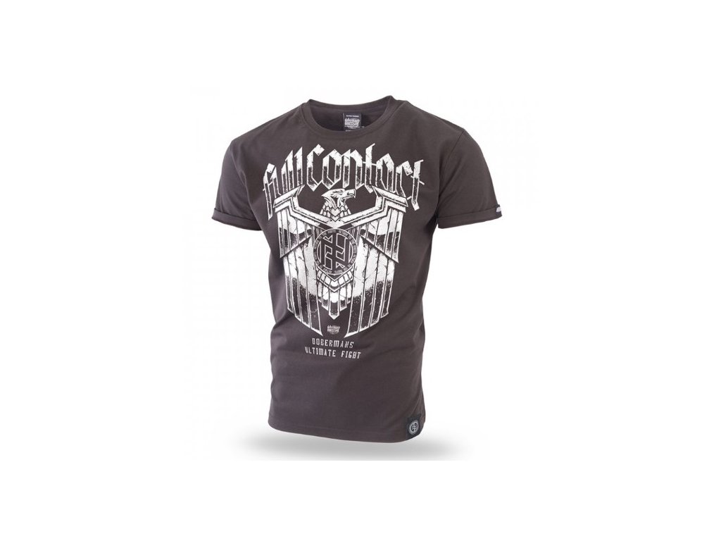 Výstřih je zakončený elastickým stahovacím lemem a zevnitř zpevněný plisováním. Přední strana je zdobená vzorem s motivem ocelového orla. Uprostřed je kulatý štít s runovým symbolem značky Doberman's Aggressive. Nad vzorem je výrazný nápis Full Contact. Na zadní straně nevelké firemní logo. Jednobarevný potisk, s viditelným efektem popraskání. Tričko se složením 100% bavlny.
