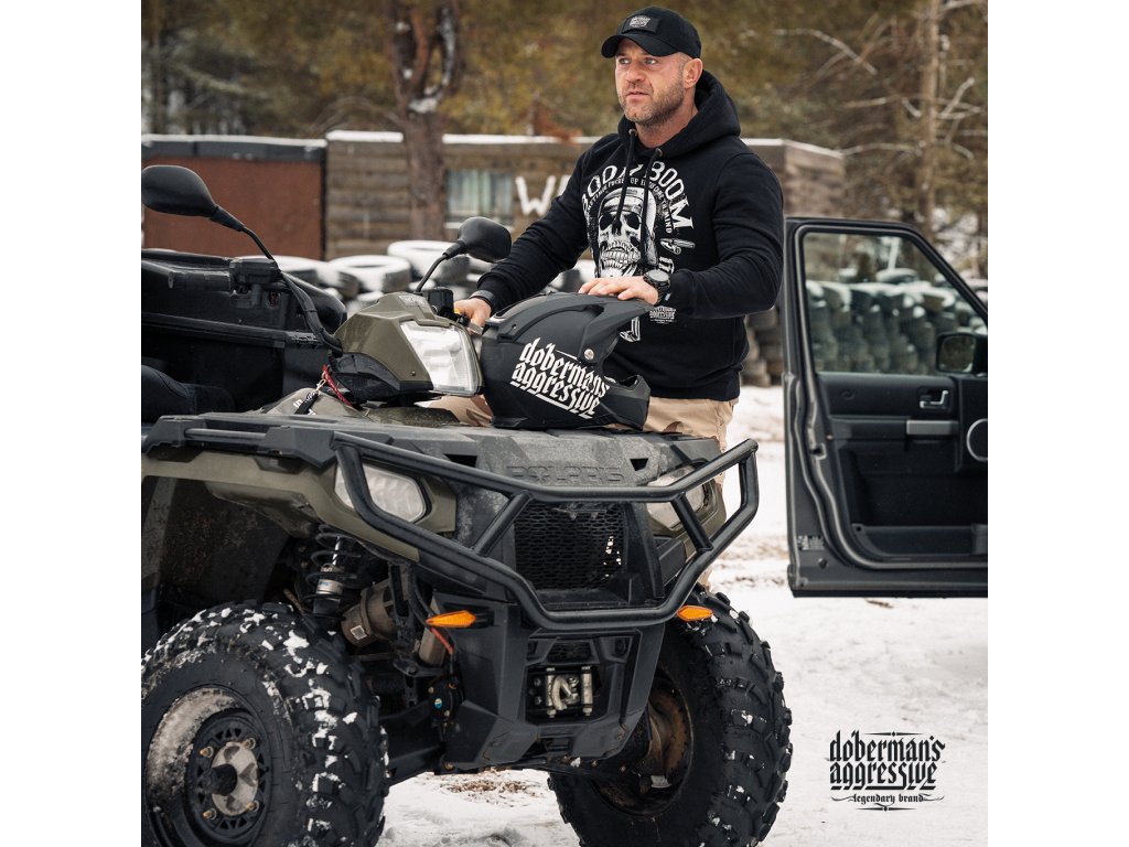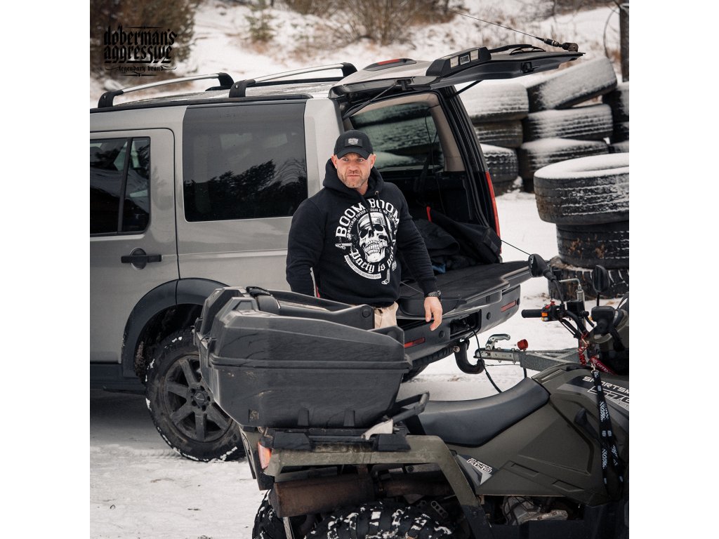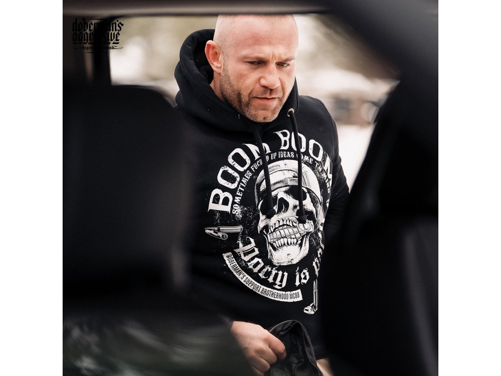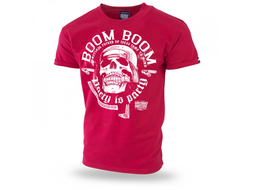 Na levém rukávu je všitá malá cedulka s logem značky. Tričko je na přední straně ozdobené vzorem lebky v kšiltovce a granátem v zubech a nápisem BOOM BOOM a logem Doberman’s Aggressive.