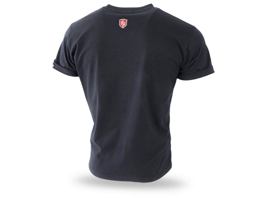 Na přední straně se nachází velký nápis DOBERMAN’S vytvořený vypouklým potiskem, spolu s vyšívanou nášivkou štítu s runovým znakem, která se nachází pod nápisem. Na krku se nachází stejná nášivka v menší velikosti.