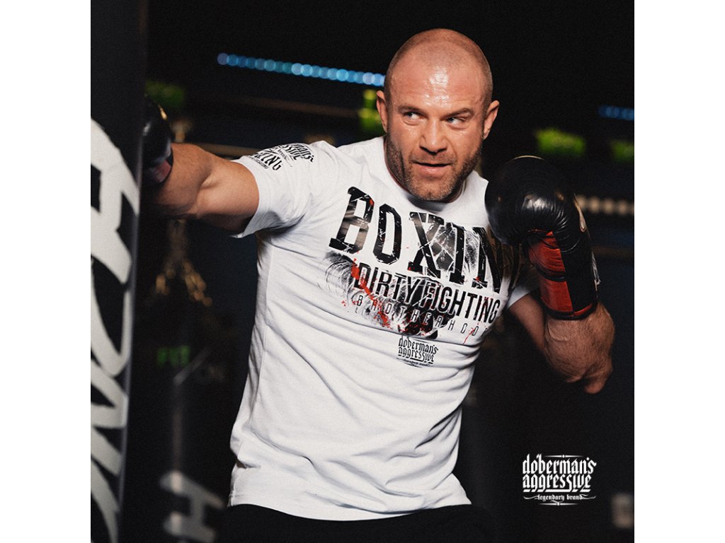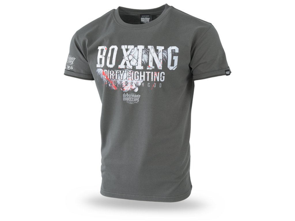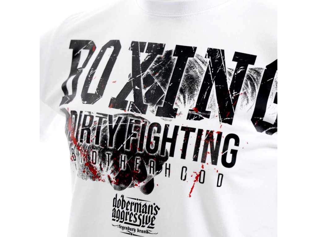 Na pravém rukávu je potisk s logem značky a nápisem BOXING DIRTY FIGHTING. Levý rukáv s našitou malou cedulkou Doberman’s Aggressive. Na přední straně je nápis BOXING DIRTY FIGHTING a logo značky na pozadí sevřných boxerských pěstí. Zadní strana je bez nápisu, na krku miniatura vzoru, který se nachází na přední straně trička.