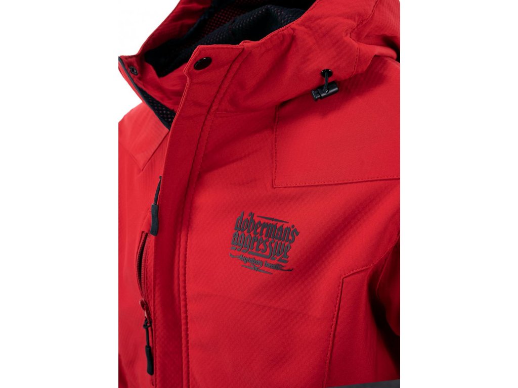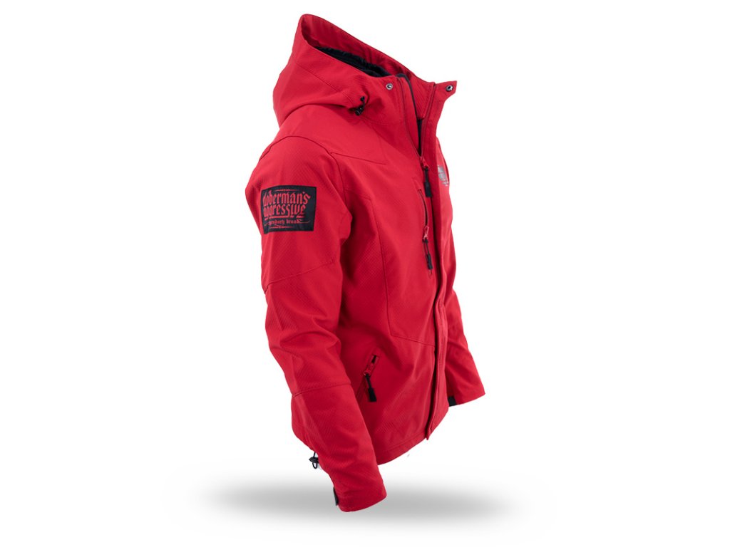 Proti větru odolný a voděodolný vzorec Softshell umožňuje nosit ji za různých povětrnostních podmínek. Standardní střih s vysokým límcem, který přechází v pohodlnou kapuci s dodatečnou ochranou proti dešti. Možnost nastavení bundy díky gumovým šňůrkám v dolní části a u kapuce, a také suchým zipům u rukávů. Bunda se zapínáním na zip, má dvě kapsy na zapínání na bocích a jednu na hrudi. Rukáv je zdobený velkou nášivkou s logem značky. Na hrudi je 3D potisk se symbolem Doberman’s Aggressive.