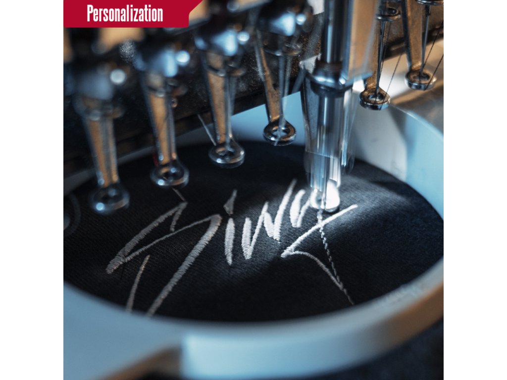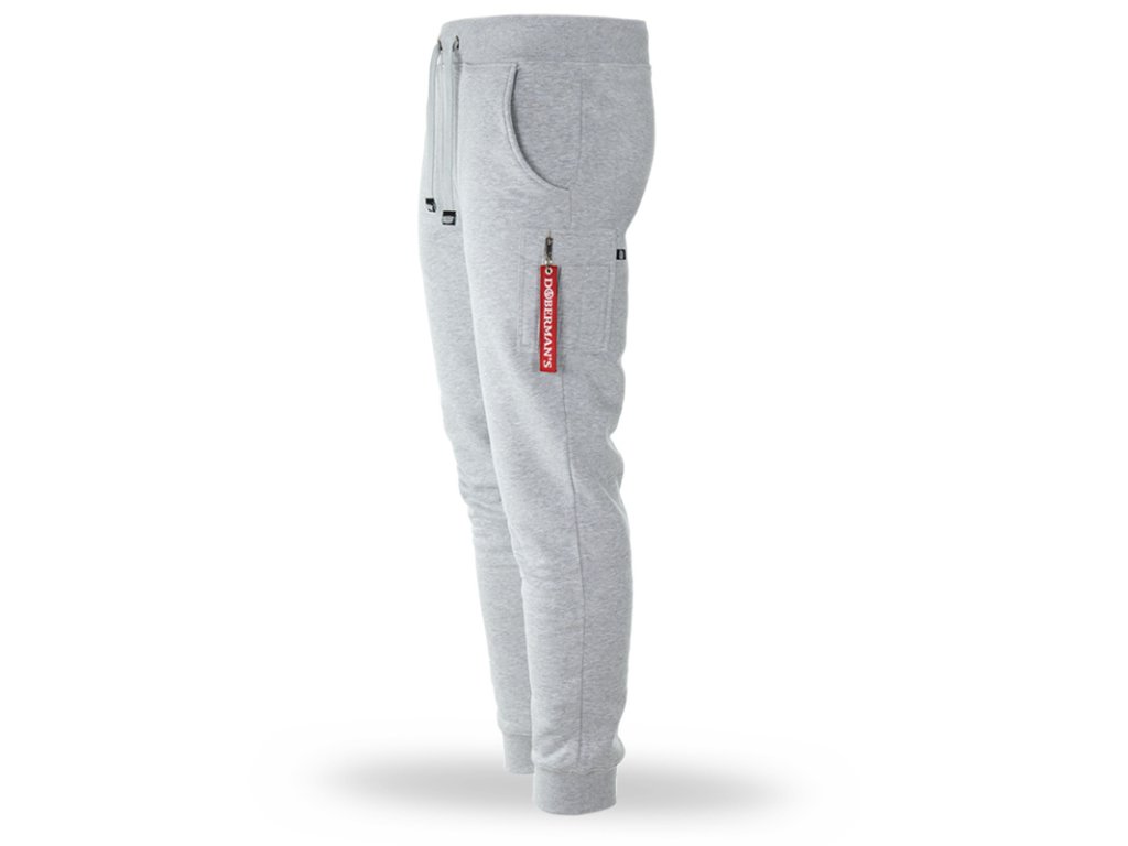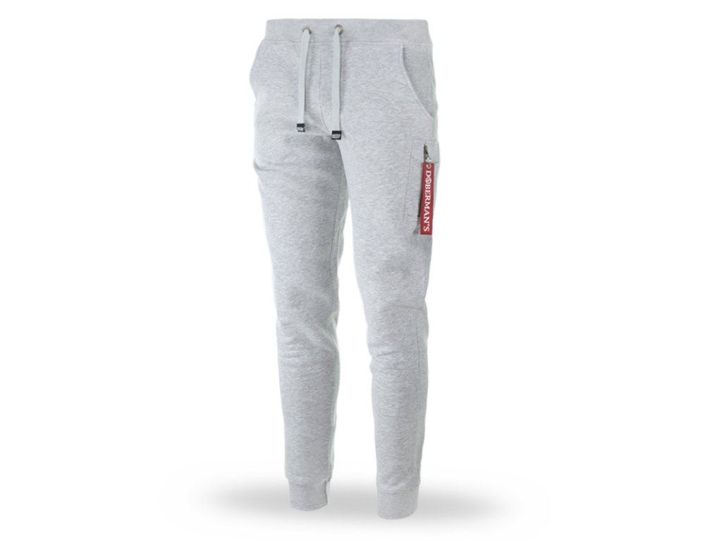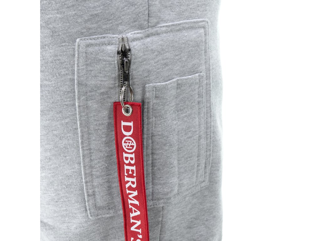 V pase jsou kalhoty nastavitelné elastickým stahovacím lemem a šňůrkami. Na nastavitelných šňůrkách jsou všité malé cedulky s logem značky. Model kalhot je doplněn další kapsou se zapínáním velkým červeným přívěškem Doberman’s Offensive.