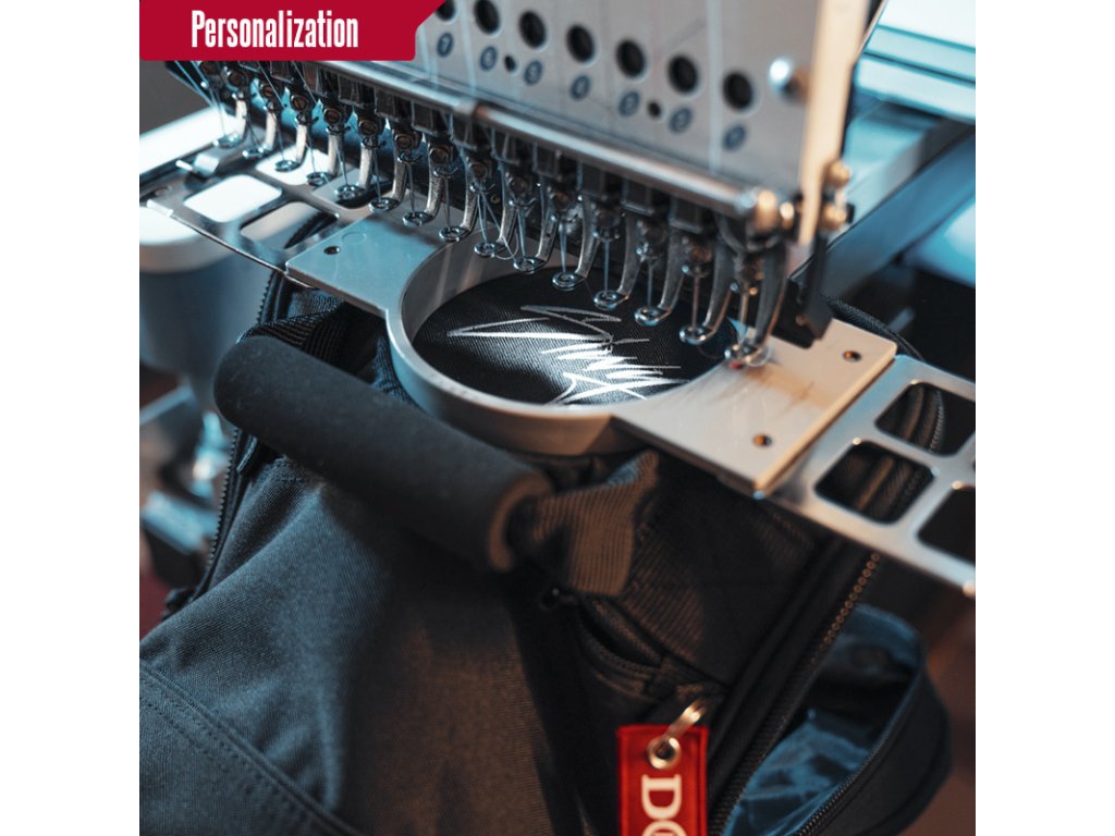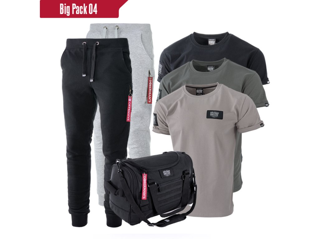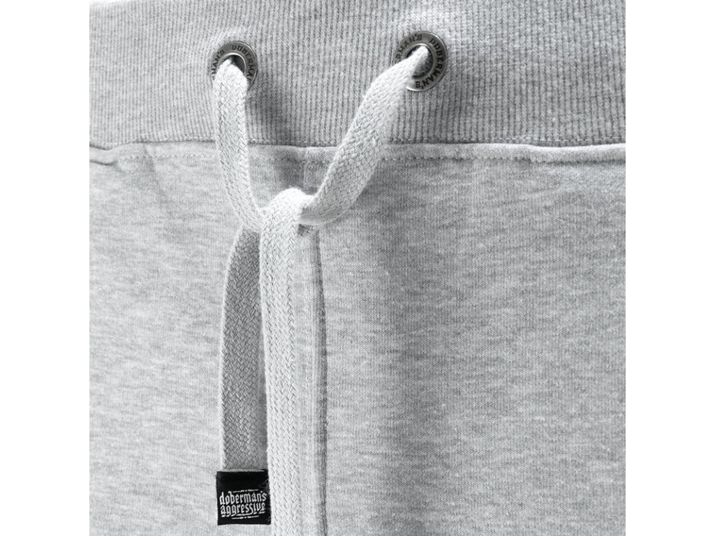 V pase jsou kalhoty nastavitelné elastickým stahovacím lemem a šňůrkami. Na nastavitelných šňůrkách jsou všité malé cedulky s logem značky. Model kalhot je doplněn další kapsou se zapínáním velkým červeným přívěškem Doberman’s Offensive.