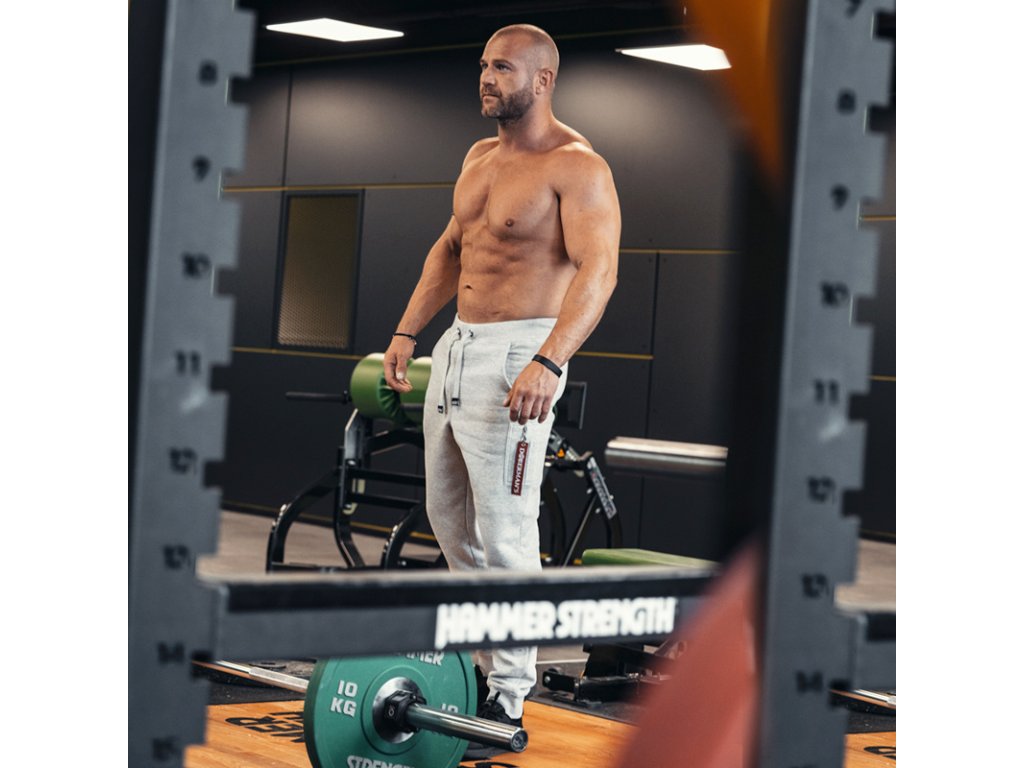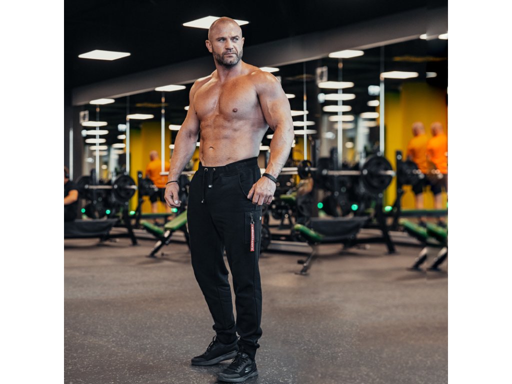 Pánské teplákové kalhoty z hrubě tkané bavlny se dvěma bočními kapsami a kapsou na zadní straně kalhot.