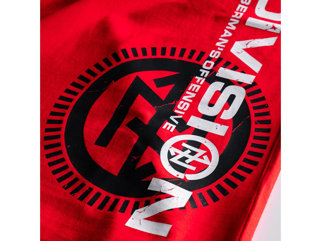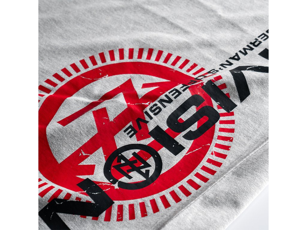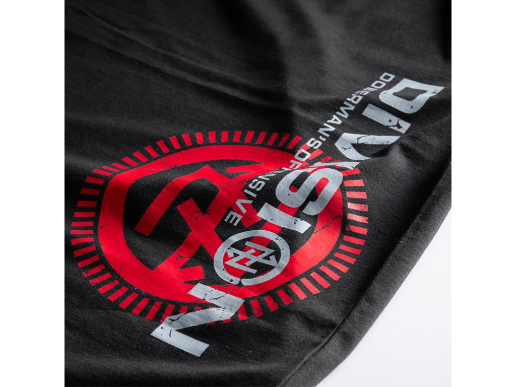 V dolní části tílka je našitá malá cedulka s logem značky. Na přední straně, na boku trička se nachází symbol Slunce Vikingů, dále nápis proveden ve svislé poloze Division Dobermans Offensive.