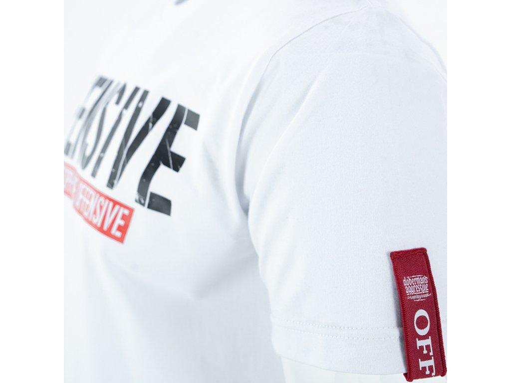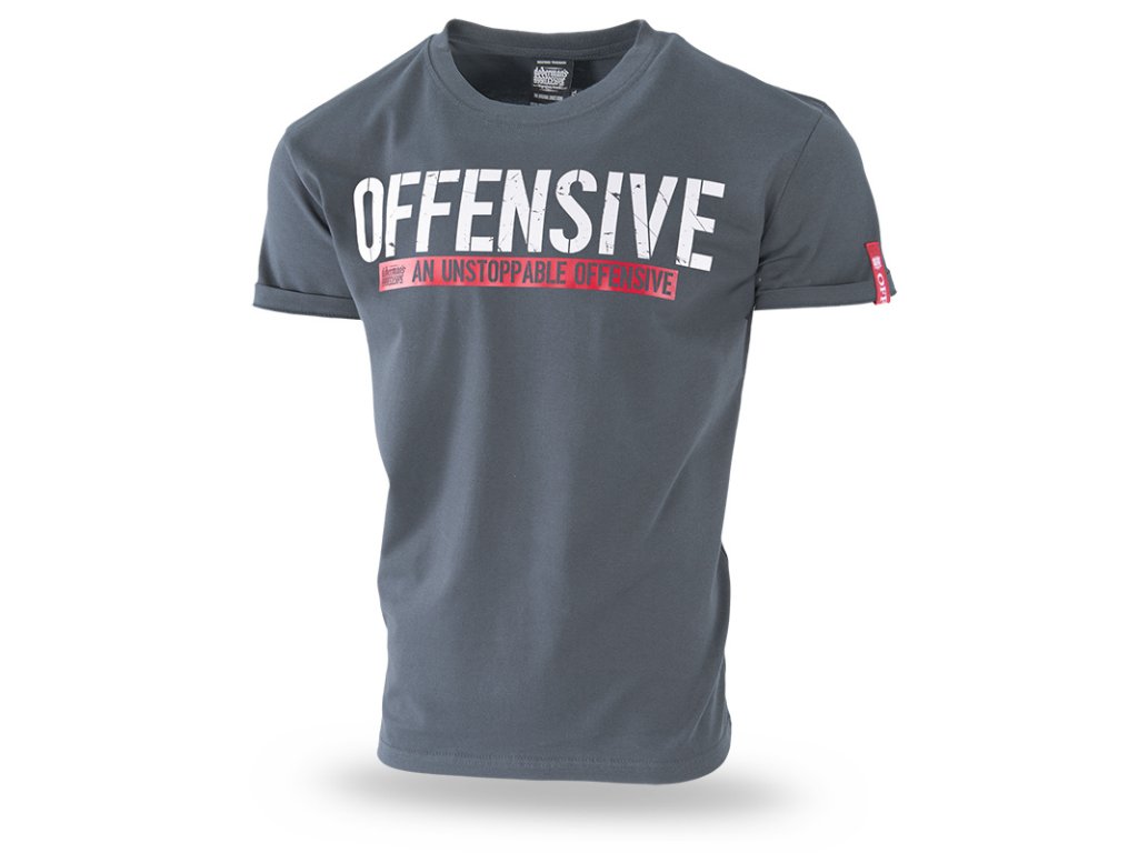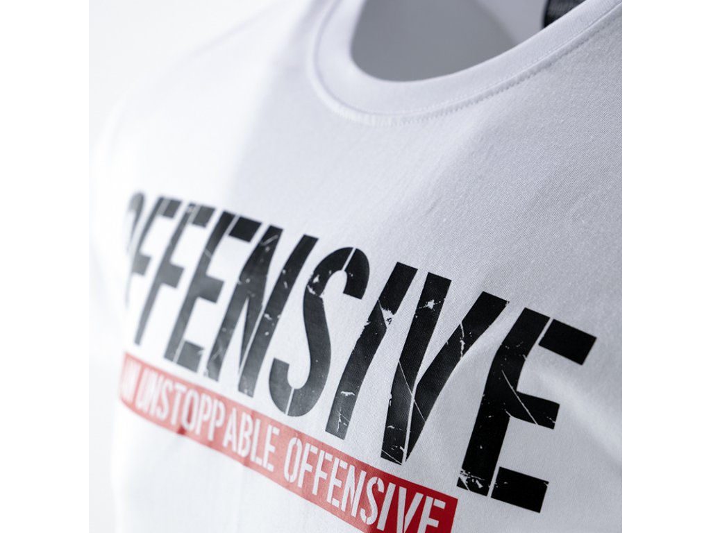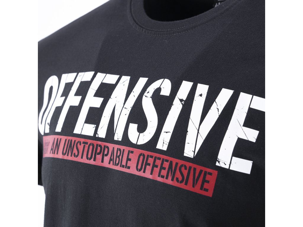 Na levém rukávu je všitá velká červená cedulka s nápisem Offensive. Tričko zdobí jednoduchý stylem, ale velice charakteristický velký potisk - OFFENSIVE, pod kterým se nachází ještě menší nápis na červeném pozadí An Unstoppable Offensive.Tričko je dostupné v mnoha barevných provedeních.