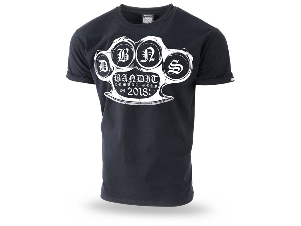 Uprostřed vzoru nápis Bandit Combat Gear of 2018. Použité gotické písmo a efekt popraskání potisku. Na krku heslo Bandit Team Doberman's Fight Gear. Standardní pánský střih trička s krátkým rukávem a stahovacím lemem u krku. Viditelné červené detaily v podobě vnitřního lemování a štítku s firemním znakem.