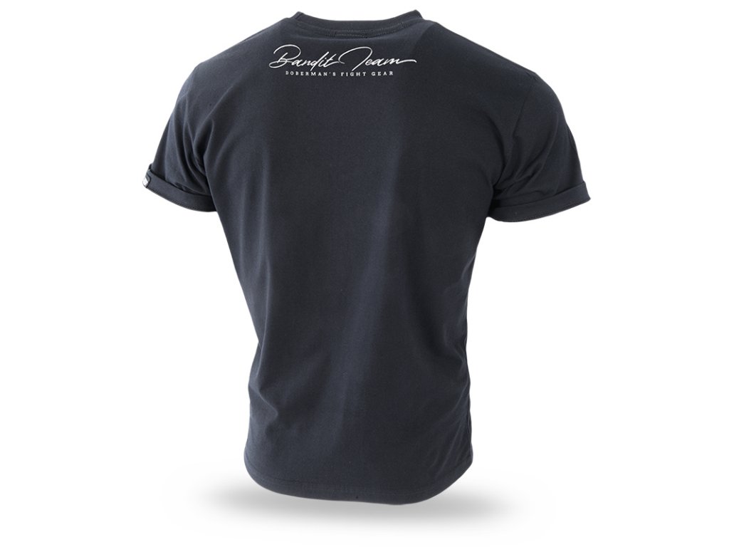 Uprostřed vzoru nápis Bandit Combat Gear of 2018. Použité gotické písmo a efekt popraskání potisku. Na krku heslo Bandit Team Doberman's Fight Gear. Standardní pánský střih trička s krátkým rukávem a stahovacím lemem u krku. Viditelné červené detaily v podobě vnitřního lemování a štítku s firemním znakem.