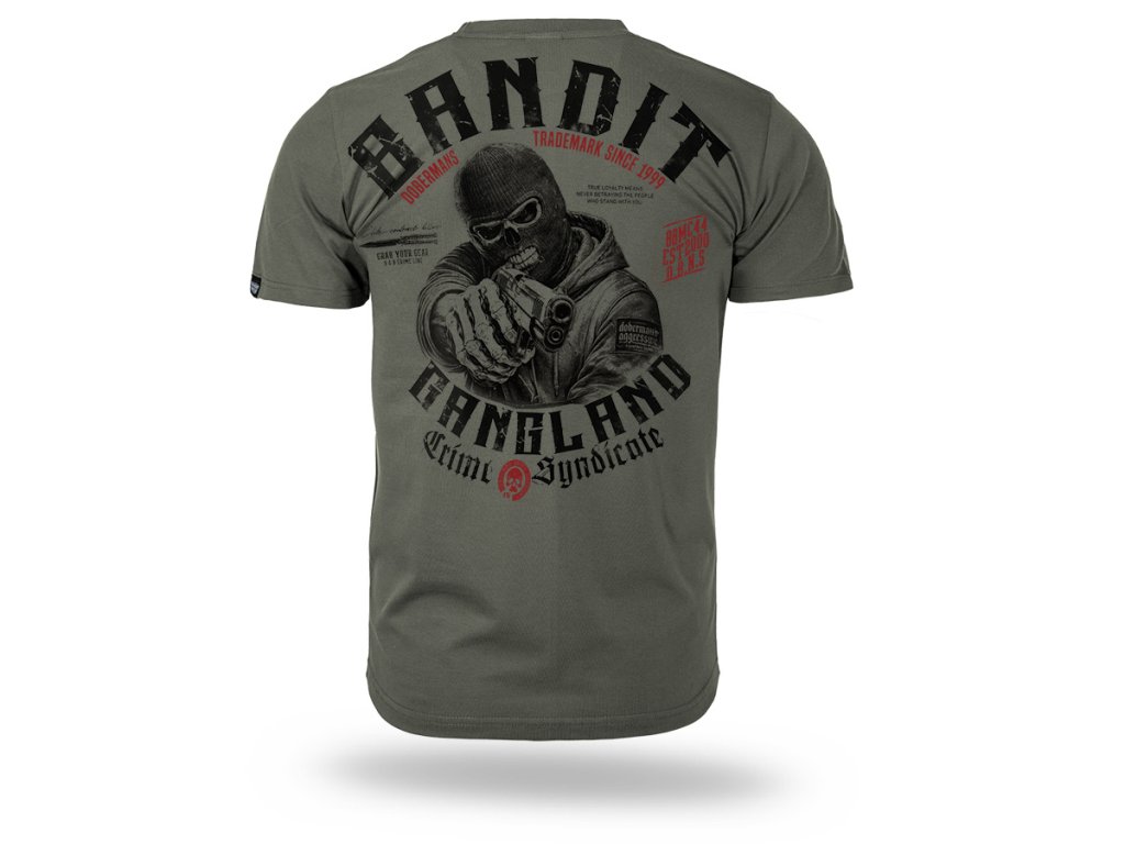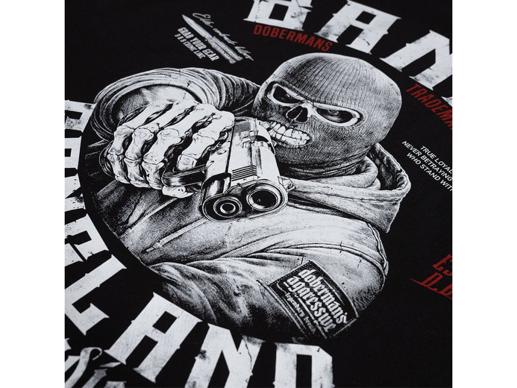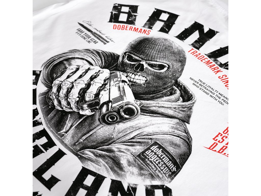 Model je vyroben v pohodlném klasickém střihu s kulatým výstřihem zakončeným elastickým nápletem. Na zadní straně se nachází velký výrazný potisk zobrazující maskovanou postavu mířící zbraní, obklopenou nápisem „Banditz Gangland Crime Syndicate“ a dalšími grafickými prvky charakteristickými pro značku Doberman’s Aggressive. Na přední straně je umístěn menší potisk na úrovni hrudi. Dynamická grafika zdůrazňuje syrový charakter inspirovaný streetwearovou kulturou.