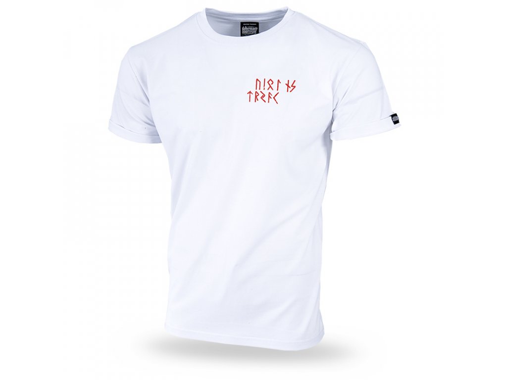 Viditelné červené prvky v podobě vnitřního plisování a boční cedulky s logem značky. Na přední straně runové symboly. Na zadní straně trička dvoubarevný vzor s hlavou medvěda a půlkruhovým nápisem Berserk přecházejícím přes švy rukávů. Použité písmo v gotickém stylu. Potisk zabírá značný povrch látky.