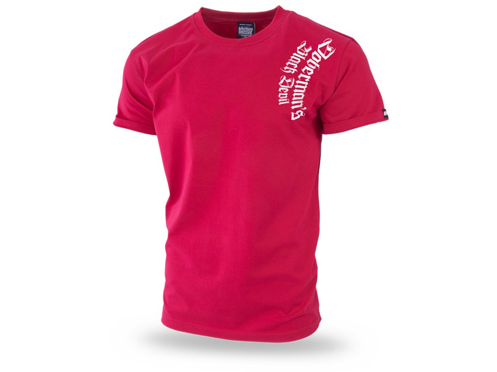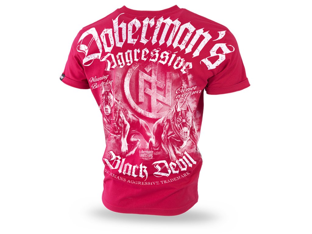U krku zakončená úzkým stahovacím lemem. Na levém rukávu je malá cedulka s logem Dobermans Aggressive. Téměř celou zadní stranu trička zabírá vzor, který představuje dva dobrmany. Za psy se nachází runový symbol. Výše je velký nápis, který přechází přes švy rukávů. Na levém rameni je nápis Dobermans Blak Devil vytištěný svisle.