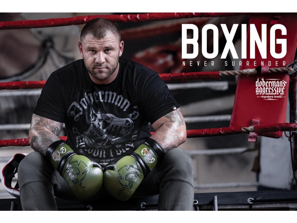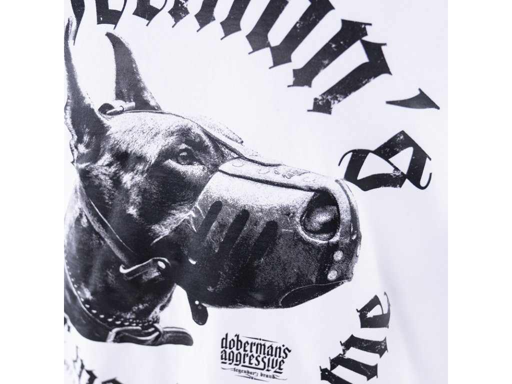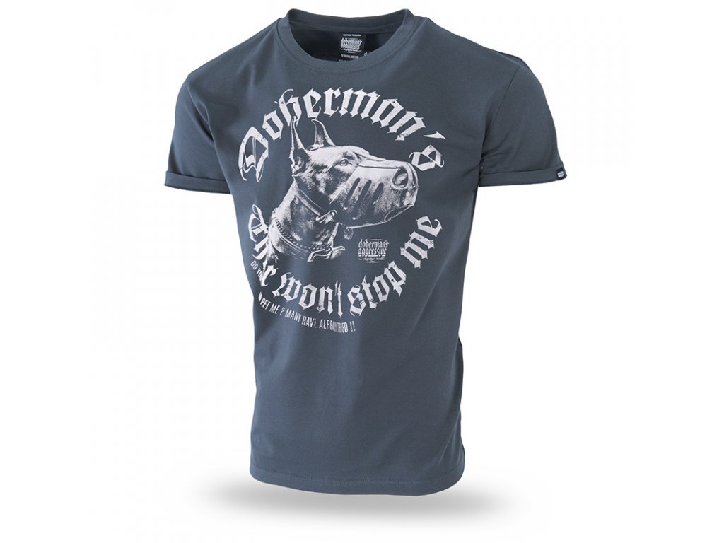 Tričko je vyrobeno z vysoce kvalitní bavlny o hmotnosti 200g. Na levém rukávu je malá cedulka s logem Dobermans Aggressive. Model s potiskem psa s náhubkem a výmluvným nápisem vytvořeným gotickými písmeny „That won’t stop me”.