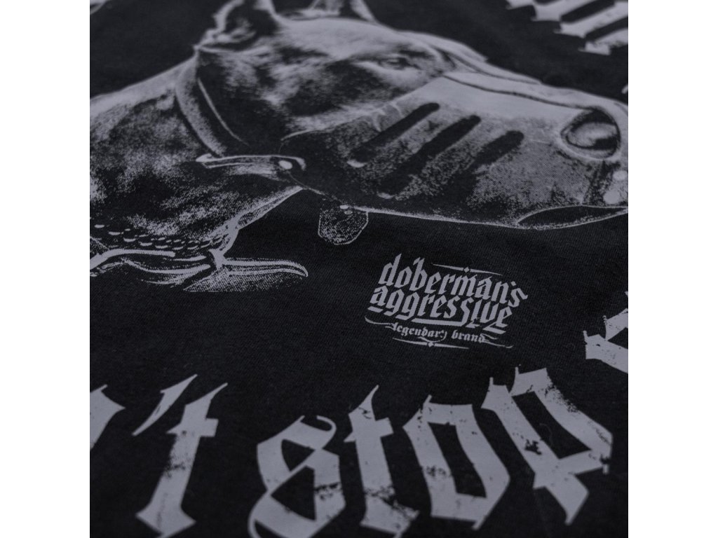 Tričko je vyrobeno z vysoce kvalitní bavlny o hmotnosti 200g. Na levém rukávu je malá cedulka s logem Dobermans Aggressive. Model s potiskem psa s náhubkem a výmluvným nápisem vytvořeným gotickými písmeny „That won’t stop me”.
