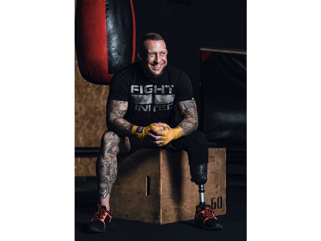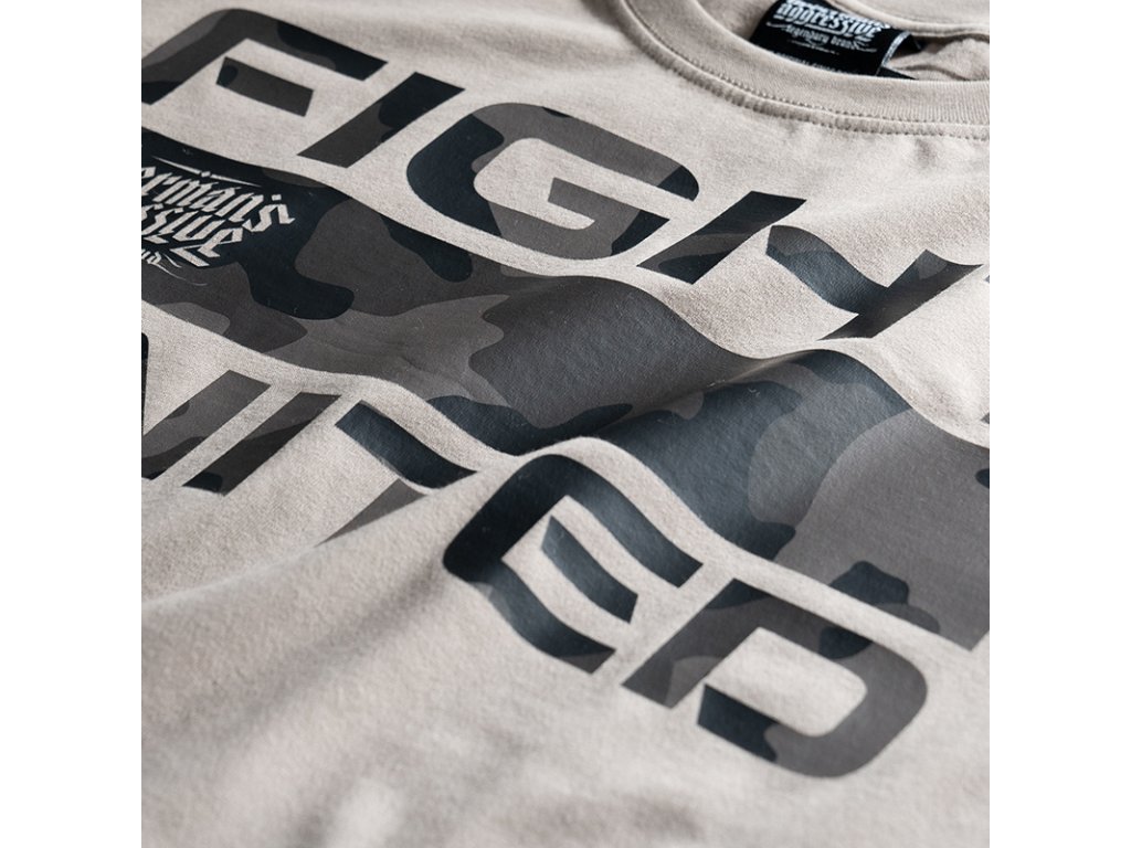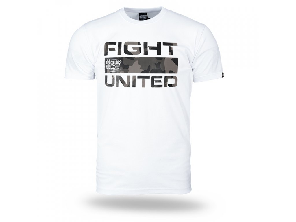 Oblečení je vyrobeno z bavlny o hmotnosti 200g. Na levém rukávu je malá cedulka s logem Doberman’s Aggressive. Na přední straně trička se nachází nápis FIGHT UNITED, který rozděluje grafický prvek od loga značky Doberman’s. Celý vzor je vytvořený v maskáčových barvách (camouflage), což vytváří skvělý efekt.