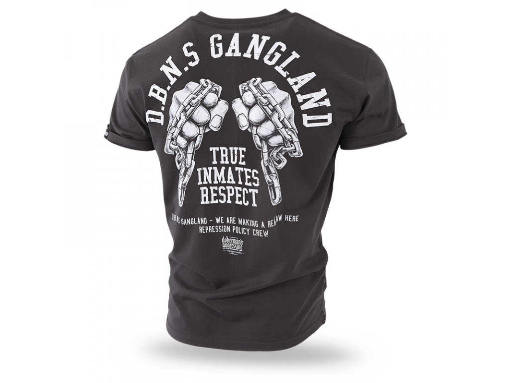 Levý rukáv s našitou malou cedulkou Doberman’s Aggressive. Model Gangland s charakteristickým vzorem na zádech, který zobrazuje zaťaté pěsti s řetězy a originální nápisy typické pro značku Doberman’s. Přední část je bez nápisu s miniaturou pěsti s nápisem na hrudi po levé straně.