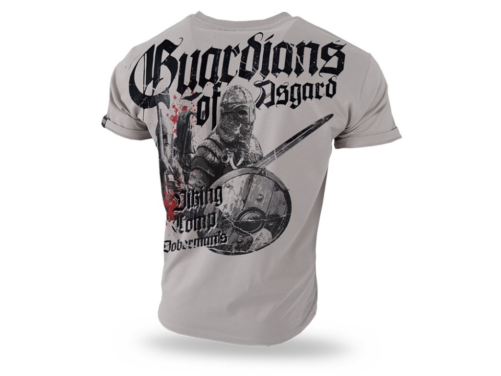 Na levém rukávu je tkaná cedulka s logem značky. Na levé straně hrudi je vytištěný šikmý nápis Guardians of Asgard. Vzor na zádech zabírá téměř celý povrch látky. Vzor z kolekce Vikings se třemi ozbrojenými Vikingy v plné zbroji. Použité gotické písmo a efekt zničení. Oblečení je vyrobeno z vysoce kvalitní bavlny.