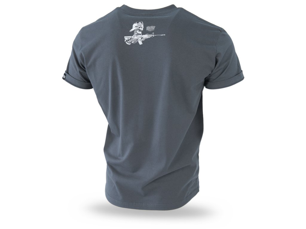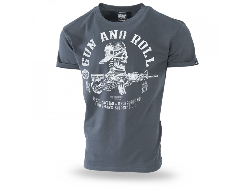 Na levém rukávu je všitá malá cedulka s logem značky. Na přední straně je vzor lebky v kšiltovce se zbraní M4 a nápisem GUN AND ROLL. Na zadní straně krku je miniatura vzoru a logo Doberman’s Aggressive.
