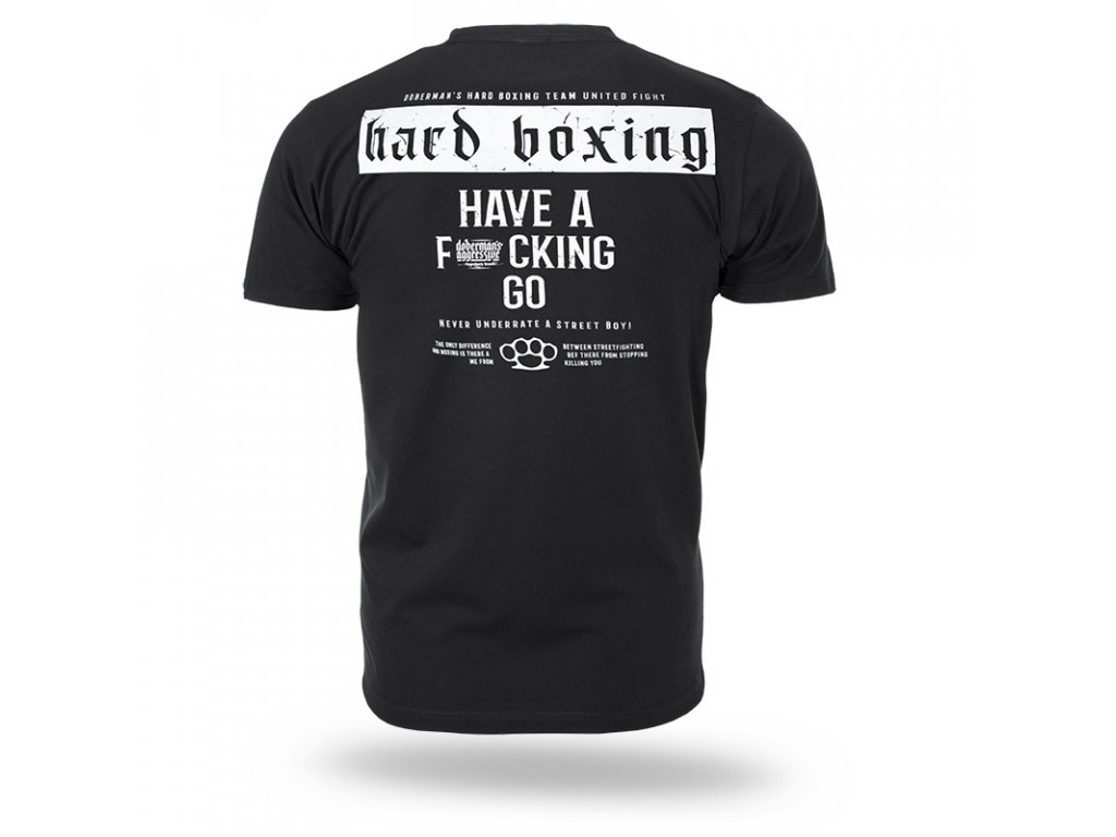Vyrobeno z bavlny o vysoké hmotnosti. Na levém rukávu je našitá malá cedulka s logem značky. Model se silným vzkazem, na zadní straně trička vzor s nápisem Hard Boxing – Have A F*cking. Přední strana navazuje na hlavní motiv.