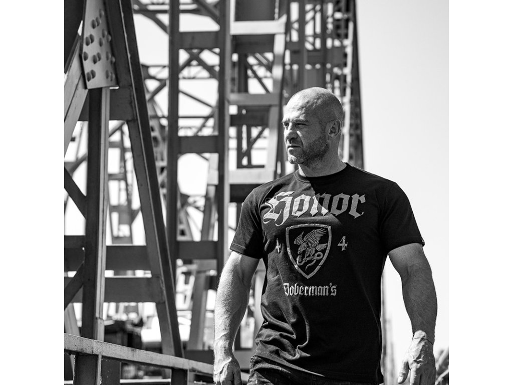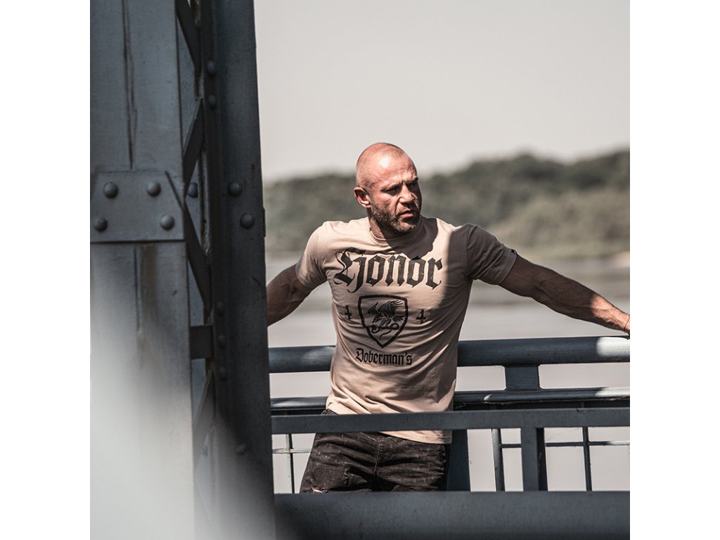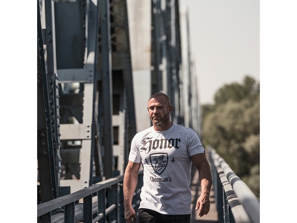 Na levém rukávu je malá cedulka s logem Doberman’s Aggressive. Na přední straně se nachází 3D potisk. Nápis „HONOR”, níže symbol orla, který chytá hada do drápů a nápis „DOBERMA’S”. Díky vypouklému vzoru vypadá tričko velice působivě.