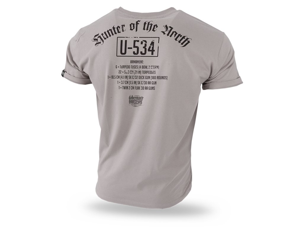 Přidáno gotický nápis Hunter Of The North. Na zádech je stejné heslo v podobě oblouku, níže označení modelu ponorky s uvedením její výzbroje. Použité jsou různé druhy písma a efekt popraskání potisku. Tričko ve standardním pánském střihu, u krku zakončené praktickým stahovacím lemem. Na rukávu je nevelký černý štítek označený logem značky Doberman's Aggressive. Model vyrobený ze stoprocentní bavlny o hmotnosti 200g. Historická kolekce.