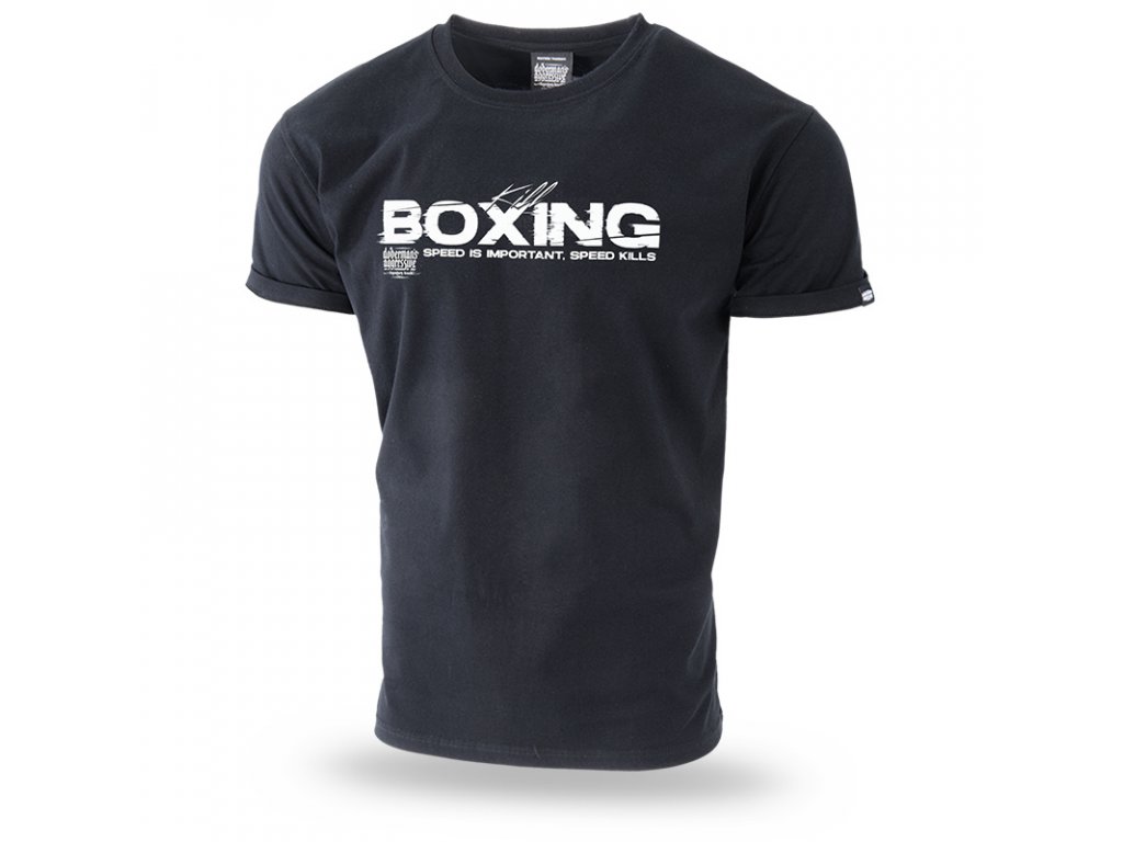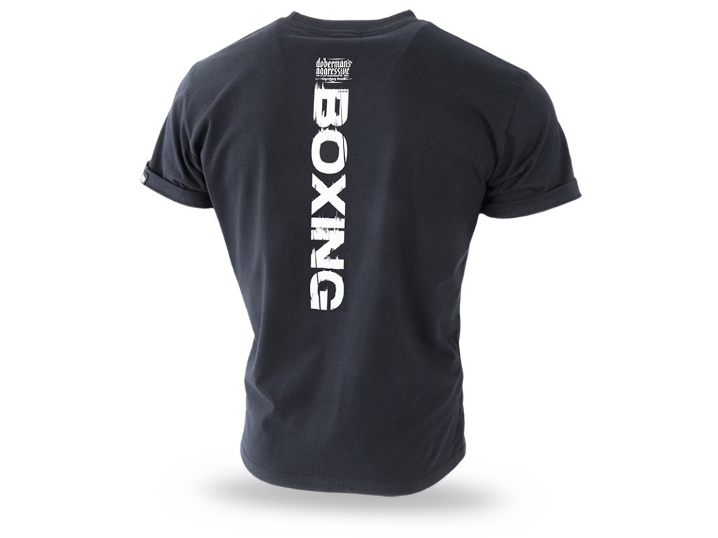 Vyrobeno z bavlny o vysoké hmotnosti. Na levém rukávu je našitá malá cedulka s logem značky. Na přední straně trička je vytištěný velký vzor s nápisem BOXING. Na zadní straně, podél zad se nachází potisk BOXING a logo DOBERMAN’S.