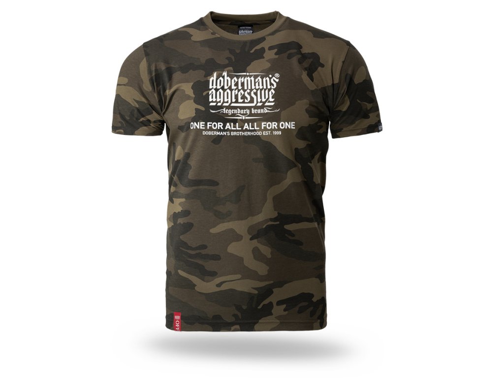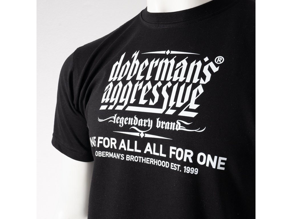 Model s kulatým výstřihem zakončeným žebrovaným lemem a krátkými rukávy, který zajišťuje pohodlí při každodenním nošení. Na přední straně se nachází výrazný potisk s logem „Doberman’s Aggressive – legendary brand“ a sloganem „One for all, all for one – Doberman’s Brotherhood est. 1999“, který zdůrazňuje charakter a identitu značky. Zadní strana trička zůstává hladká, což dodává celku minimalistický vzhled a zvýrazňuje výrazné sdělení na přední straně.