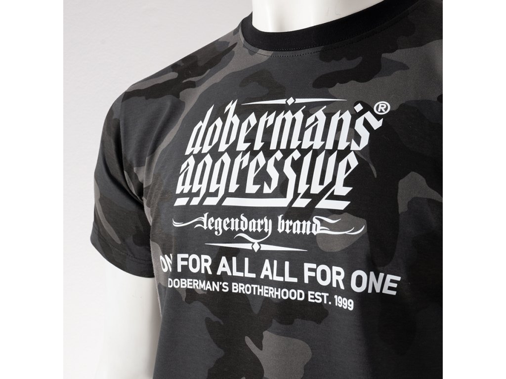 Model s kulatým výstřihem zakončeným žebrovaným lemem a krátkými rukávy, který zajišťuje pohodlí při každodenním nošení. Na přední straně se nachází výrazný potisk s logem „Doberman’s Aggressive – legendary brand“ a sloganem „One for all, all for one – Doberman’s Brotherhood est. 1999“, který zdůrazňuje charakter a identitu značky. Zadní strana trička zůstává hladká, což dodává celku minimalistický vzhled a zvýrazňuje výrazné sdělení na přední straně.