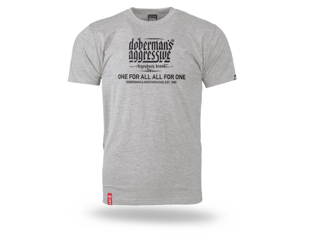 Model s kulatým výstřihem zakončeným žebrovaným lemem a krátkými rukávy, který zajišťuje pohodlí při každodenním nošení. Na přední straně se nachází výrazný potisk s logem „Doberman’s Aggressive – legendary brand“ a sloganem „One for all, all for one – Doberman’s Brotherhood est. 1999“, který zdůrazňuje charakter a identitu značky. Zadní strana trička zůstává hladká, což dodává celku minimalistický vzhled a zvýrazňuje výrazné sdělení na přední straně.