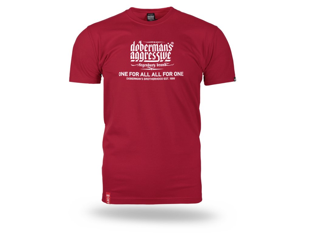 Model s kulatým výstřihem zakončeným žebrovaným lemem a krátkými rukávy, který zajišťuje pohodlí při každodenním nošení. Na přední straně se nachází výrazný potisk s logem „Doberman’s Aggressive – legendary brand“ a sloganem „One for all, all for one – Doberman’s Brotherhood est. 1999“, který zdůrazňuje charakter a identitu značky. Zadní strana trička zůstává hladká, což dodává celku minimalistický vzhled a zvýrazňuje výrazné sdělení na přední straně.