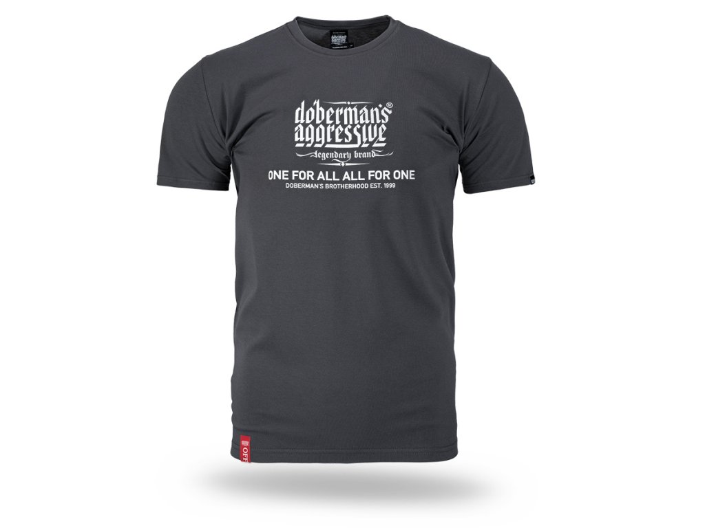 Model s kulatým výstřihem zakončeným žebrovaným lemem a krátkými rukávy, který zajišťuje pohodlí při každodenním nošení. Na přední straně se nachází výrazný potisk s logem „Doberman’s Aggressive – legendary brand“ a sloganem „One for all, all for one – Doberman’s Brotherhood est. 1999“, který zdůrazňuje charakter a identitu značky. Zadní strana trička zůstává hladká, což dodává celku minimalistický vzhled a zvýrazňuje výrazné sdělení na přední straně.