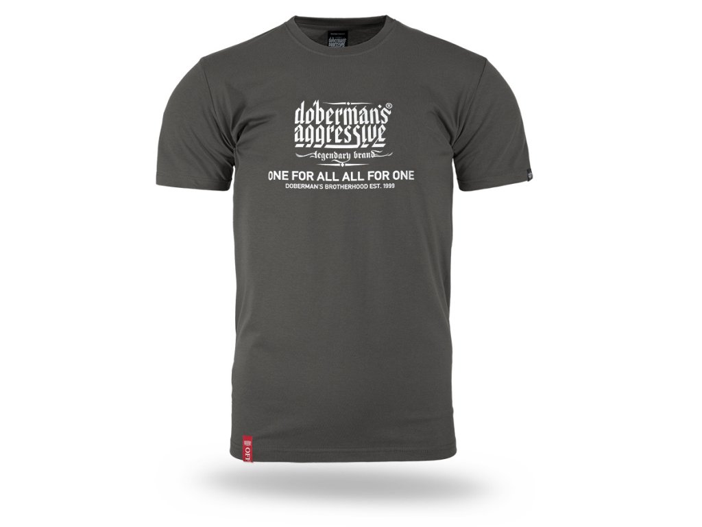 Model s kulatým výstřihem zakončeným žebrovaným lemem a krátkými rukávy, který zajišťuje pohodlí při každodenním nošení. Na přední straně se nachází výrazný potisk s logem „Doberman’s Aggressive – legendary brand“ a sloganem „One for all, all for one – Doberman’s Brotherhood est. 1999“, který zdůrazňuje charakter a identitu značky. Zadní strana trička zůstává hladká, což dodává celku minimalistický vzhled a zvýrazňuje výrazné sdělení na přední straně.