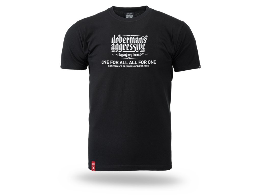 Model s kulatým výstřihem zakončeným žebrovaným lemem a krátkými rukávy, který zajišťuje pohodlí při každodenním nošení. Na přední straně se nachází výrazný potisk s logem „Doberman’s Aggressive – legendary brand“ a sloganem „One for all, all for one – Doberman’s Brotherhood est. 1999“, který zdůrazňuje charakter a identitu značky. Zadní strana trička zůstává hladká, což dodává celku minimalistický vzhled a zvýrazňuje výrazné sdělení na přední straně.
