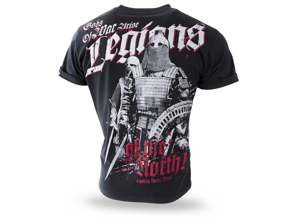 Pod krkem je zakončeno úzkým plisováním. Na levém rukávu je malá cedulka s firemním logem. Na přední straně, u levého okraje trička je potisk s velkým nápisem Legion. Záda jsou téměř celá potištěná. Uprostřed vzoru se nachází dva bojovníci v plné zbroji. Výše je heslo Legions on the North. Vzor ve dvou barvách.
