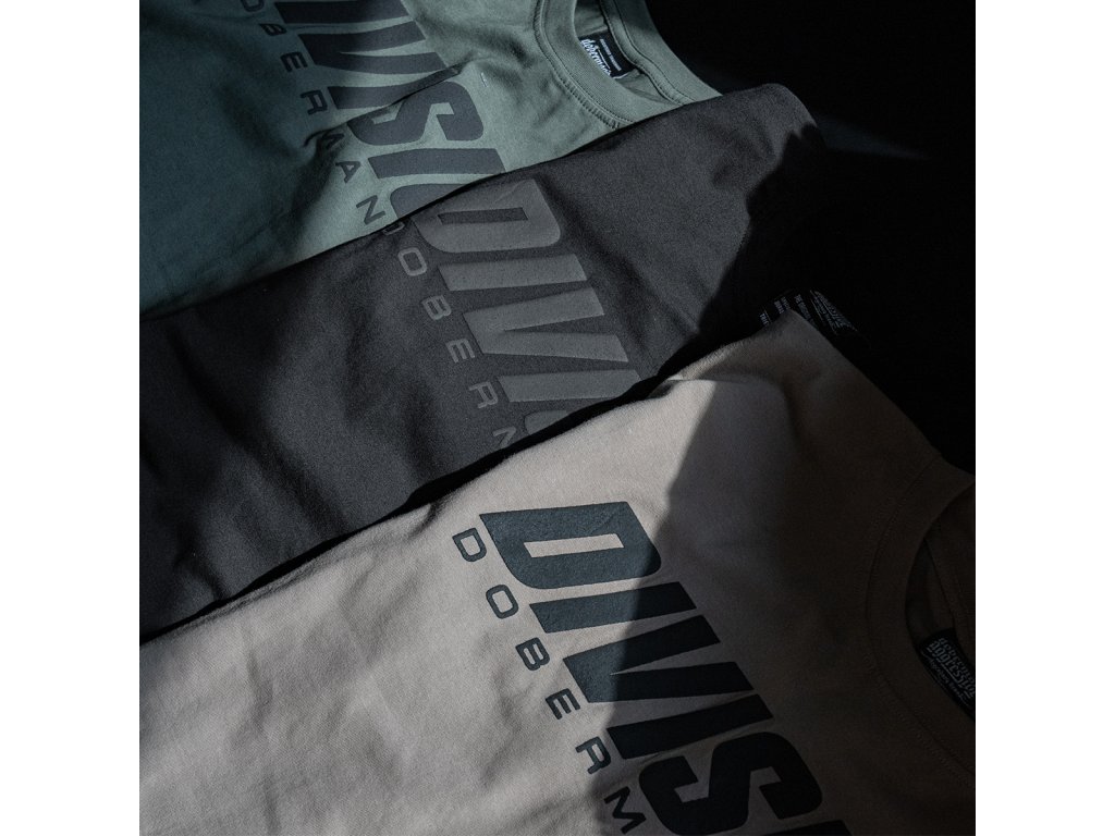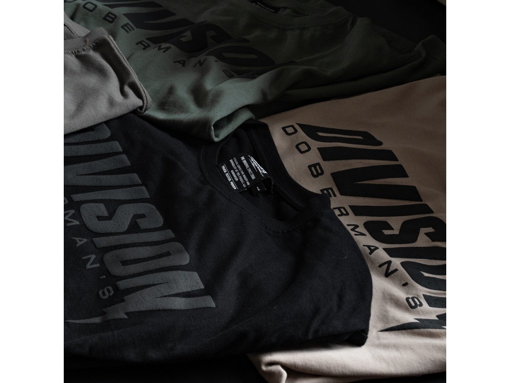 Oblečení je vyrobeno z bavlny o hmotnosti 200g. Na levém rukávu je malá cedulka s logem Doberman’s Aggressive. Na přední straně trička se nachází nápis DIVISION napsaný tučným písmem, navíc do písmene N byl začleněn symbol blesku, který všemu dodává jedinečný charakter. V dolní části je nápis DOBERMANS. Celek vzoru je vytvořený metodou vypouklého potisku, díky tomu je tento model ještě více jedinečný.